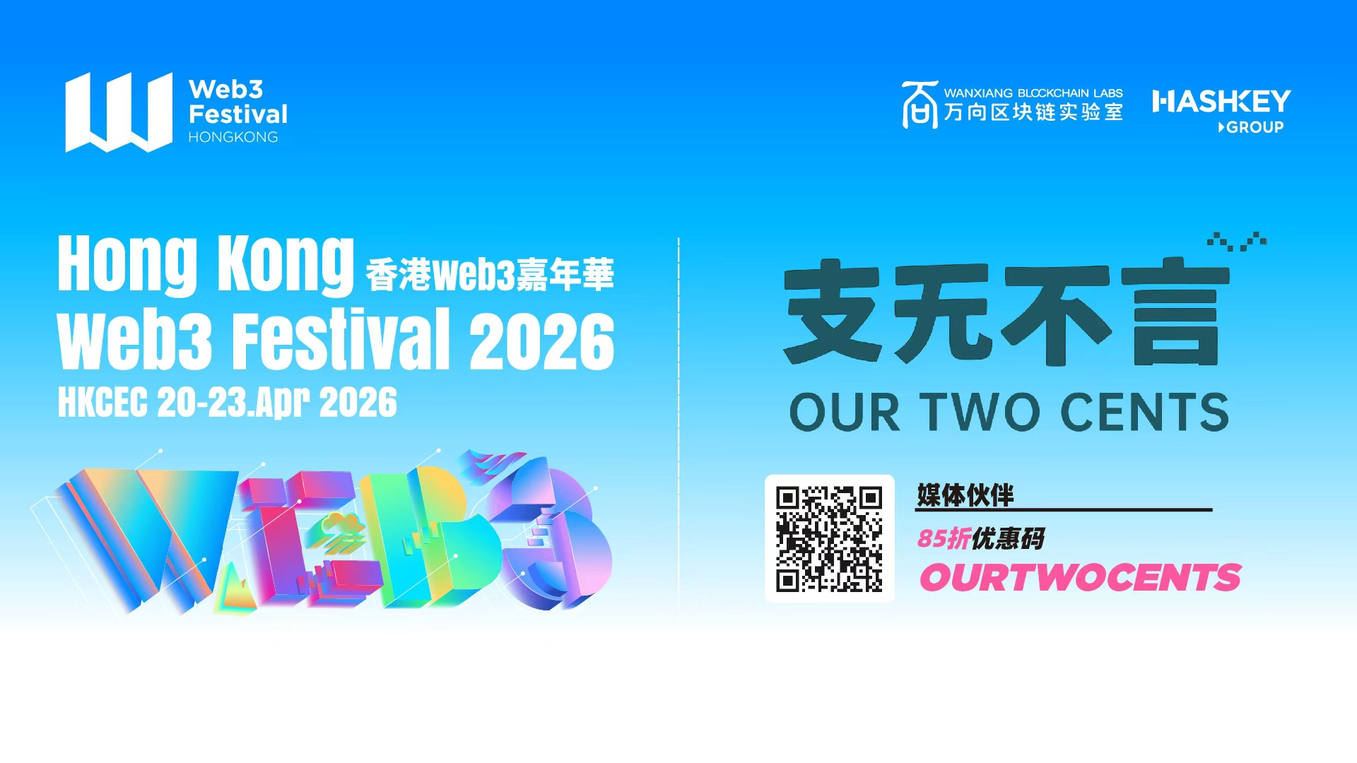 4月20号到23号,2026香港Web3嘉年华将在香港会展中心举办。这是由万向区块链实验室和HashKey Group联合打造的行业顶级峰会,今年的三大核心议题分别聚焦传统金融与加密金融的合流、AI与Web3的价值重构,以及RWA的前沿探讨。支无不言很荣幸作为本届活动的合作媒体,我们也为听众朋友们争取到了专属的85折购票优惠,扫描下方二维码即可获取。