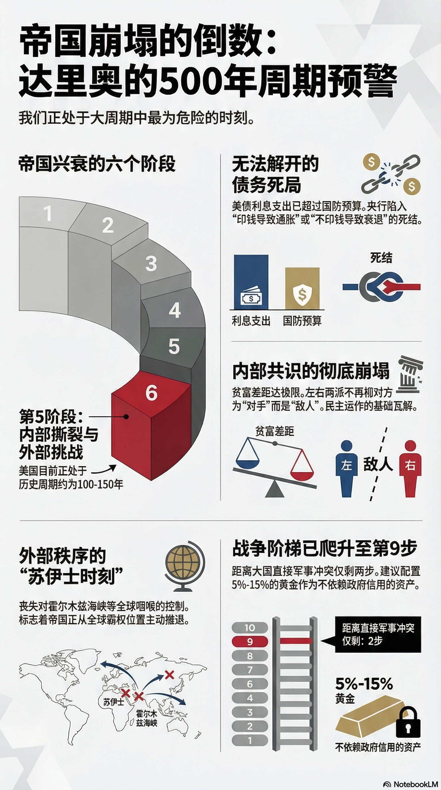 历史正从书架走进现实。达里奥近期发出严厉警告:美国已正式踏入其兴衰模型的“第五阶段”(Stage 5)——即帝国崩塌前的倒数第二个阶段。这不再只是宏观层面的理论博弈,而是一场关于500年周期律是否不可逾越的终极考验。