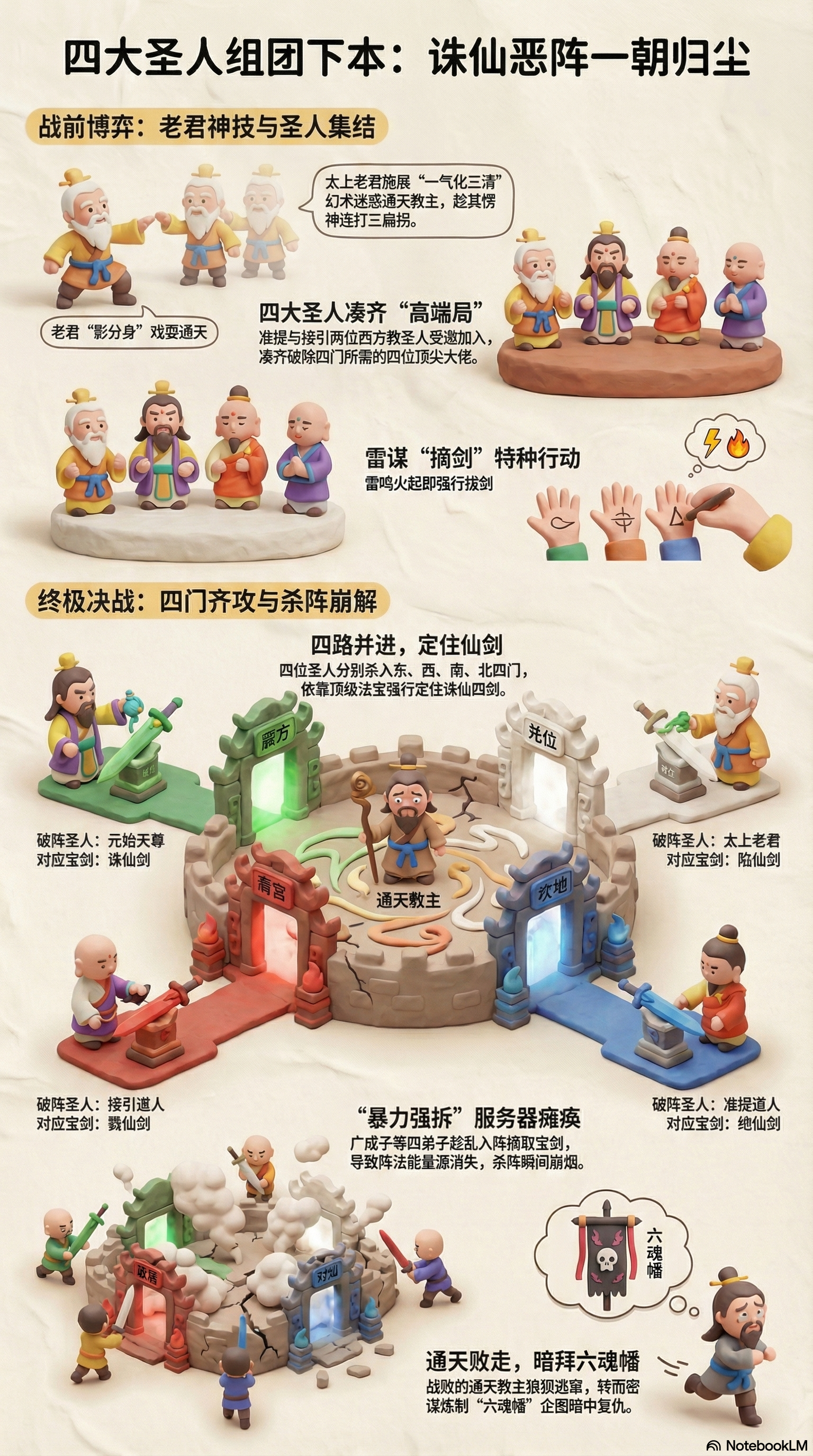- 太上老君(老子):三清之首,玄门大师兄。本集中骑青牛下界,先入诛仙阵,以“一气化三清”神通迷惑并击打通天教主,后用风火蒲团擒拿多宝道人,最终与元始、接引、准提共破诛仙阵。