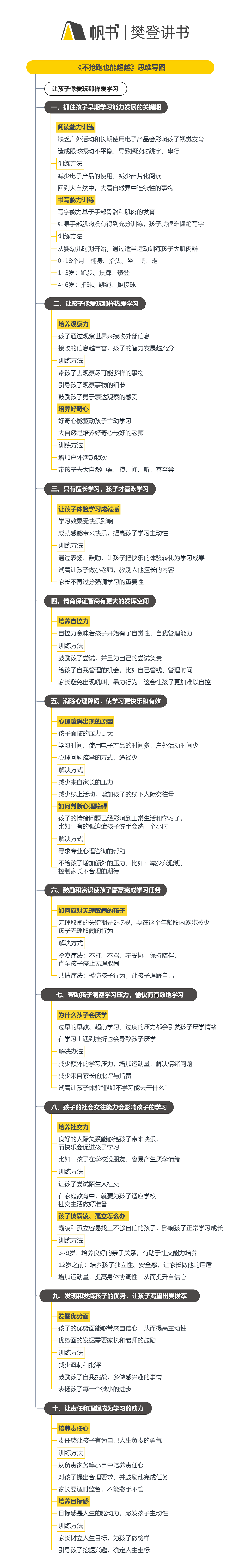 主播介绍—— 樊登樊登,帆书(原樊登读书)创始人、首席内容官。《可复制的领导力》、《低风险创业》、《陪孩子终身成长》作者。国际大专辩论赛冠军。本期嘉宾—— 杨霞杨霞,北京大学心理学系毕业,北京协和医学院心理学专家,拥有30年儿童心理问题咨询、矫治临床经验。思维导图——《不抢跑也能超越》