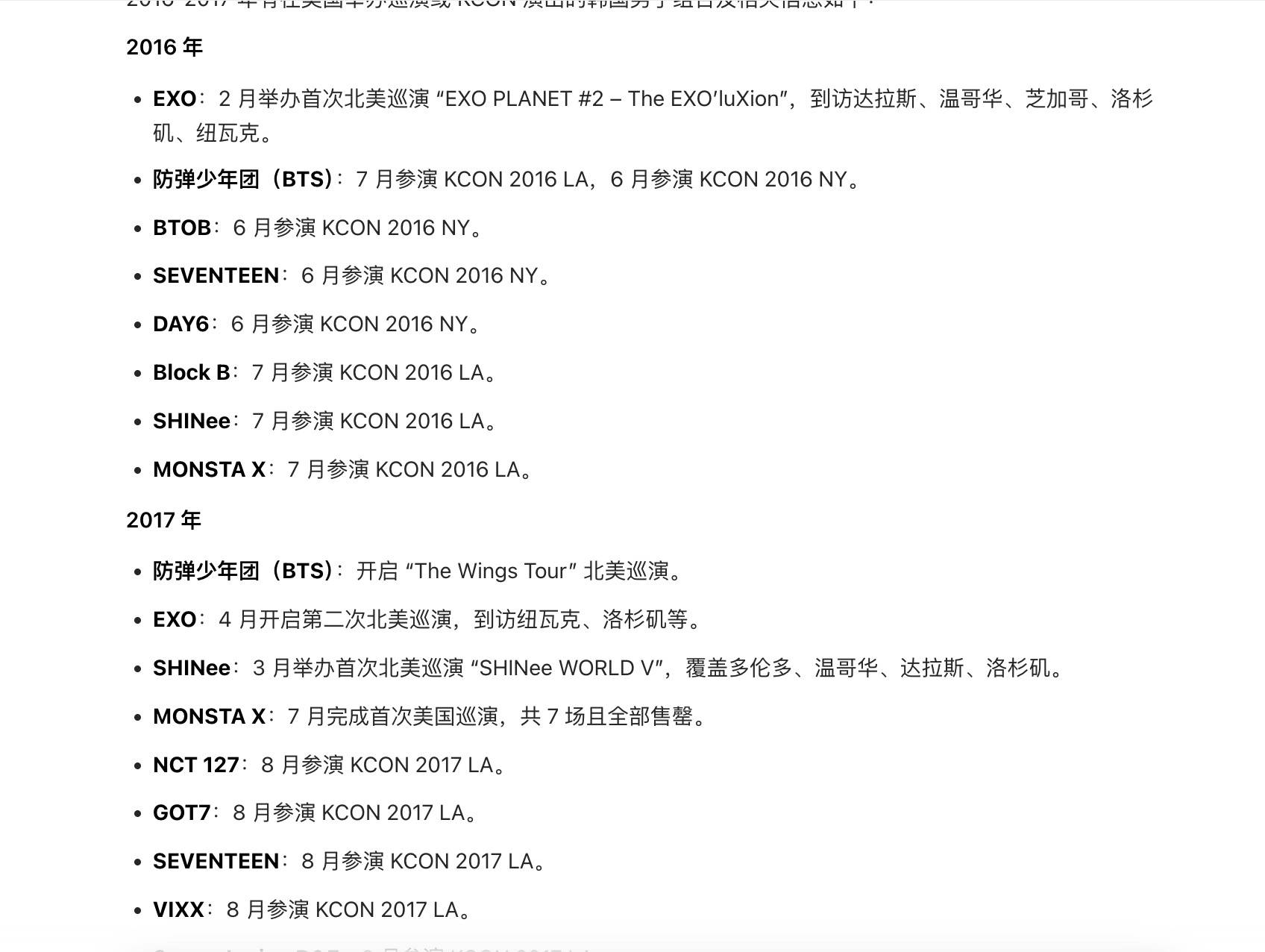 慧子老师提到第二个艺人当年在美国巡演,然后有群友就查了那一年是哪些韩团有去美国: