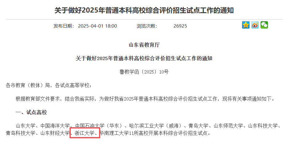 5.浙江大学退出2026山东综合评价招生,试点高校减至10所