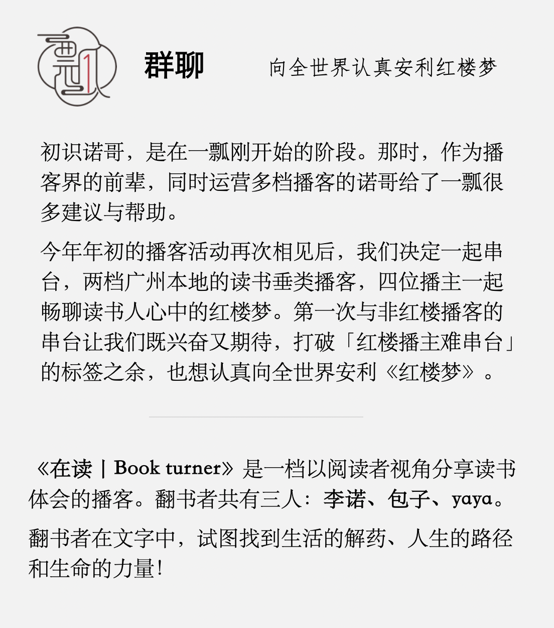 搜索「一瓢红楼梦」,即可在小宇宙、荔枝、苹果podcast、网易云音乐、喜马拉雅、豆瓣等平台收听内容,期待你在「豆瓣」打分评价,欢迎在评论区留下你的疑问或者联系我们,点菜你想听的故事。