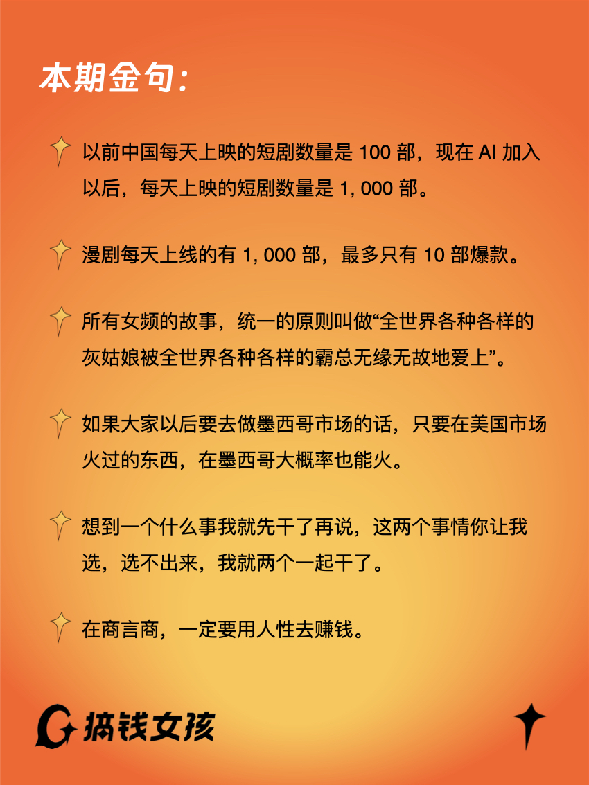 “以前中国每天上映的短剧数量是 100 部,现在 AI 加入以后,每天上映的短剧数量是 1000 部。”