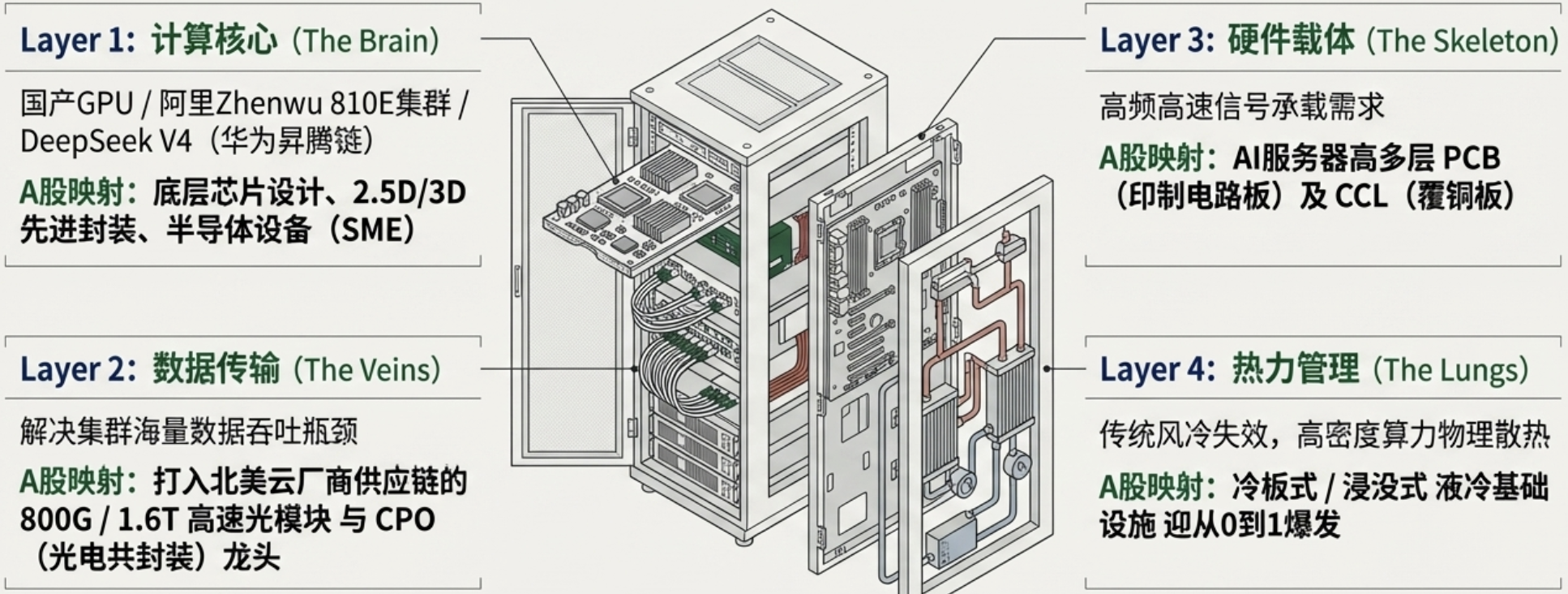 低端出口制造: 受海运成本飙升和关税威胁,缺乏定价权的制造业将迎来业绩双杀。 - 重点布局:核心算力“卖水人”: 紧盯打入北美供应链的800G/1.6T光模块(CPO)、高阶PCB及液冷龙头。这是目前全球唯一确定性的增长点。