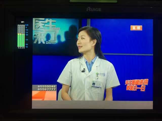 这张照片拍摄于严蕾医生在四川省人民医院工作期间,参与四川电视台《医生来了》直播。