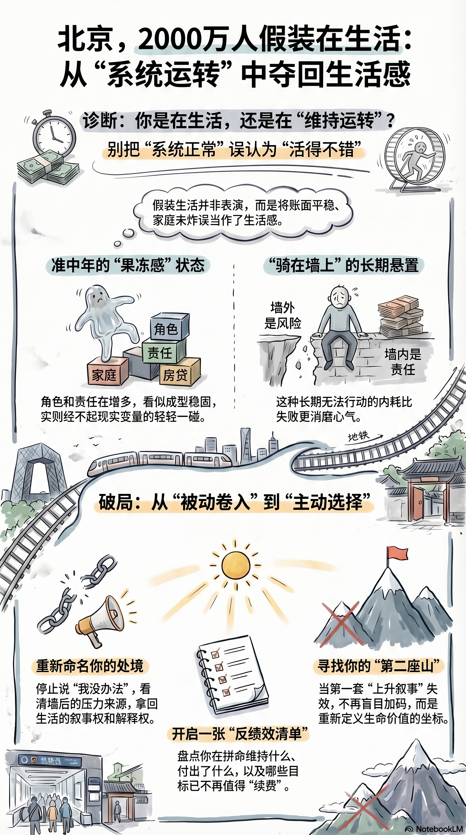 借《北京,有2000万人假装在生活》这本薄书,拆开一种很多城市职场人都熟悉却说不清的感受:日程很满、责任很多、生活看似稳定,却越来越像在维持系统而不是在生活。