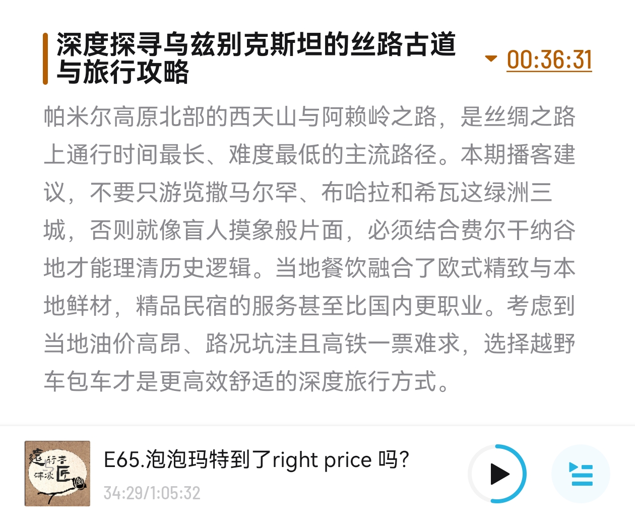 沙漠绿洲三城的商业化超我预期。克孜勒库姆沙漠中的qala令我偏爱。费尔干纳谷地才是中亚的真实人文胜地,帕米尔天山-阿赖丝路古道不能错过。