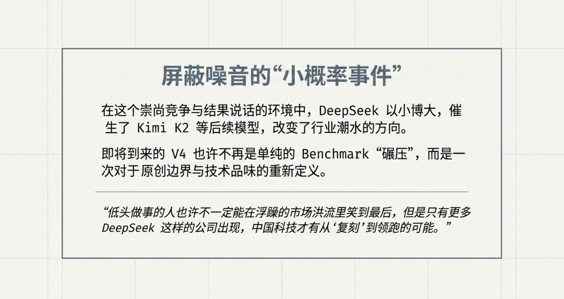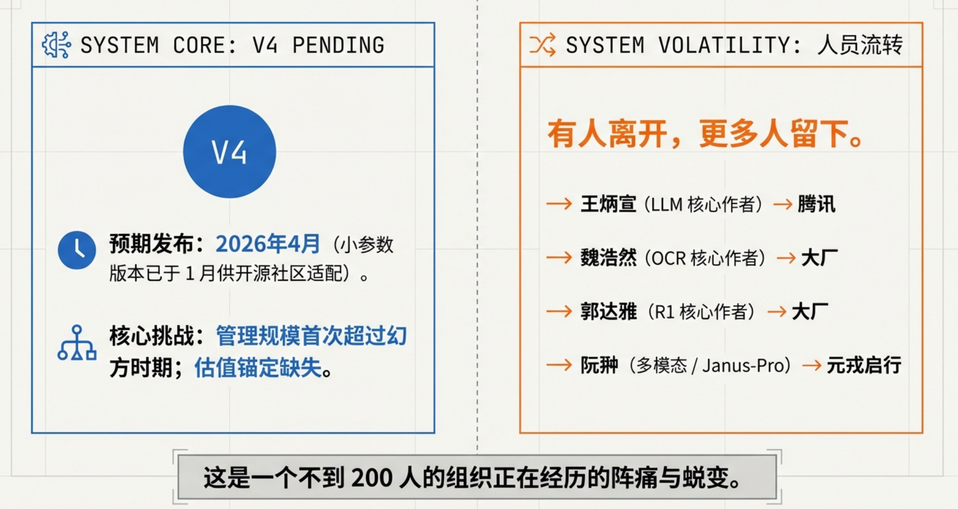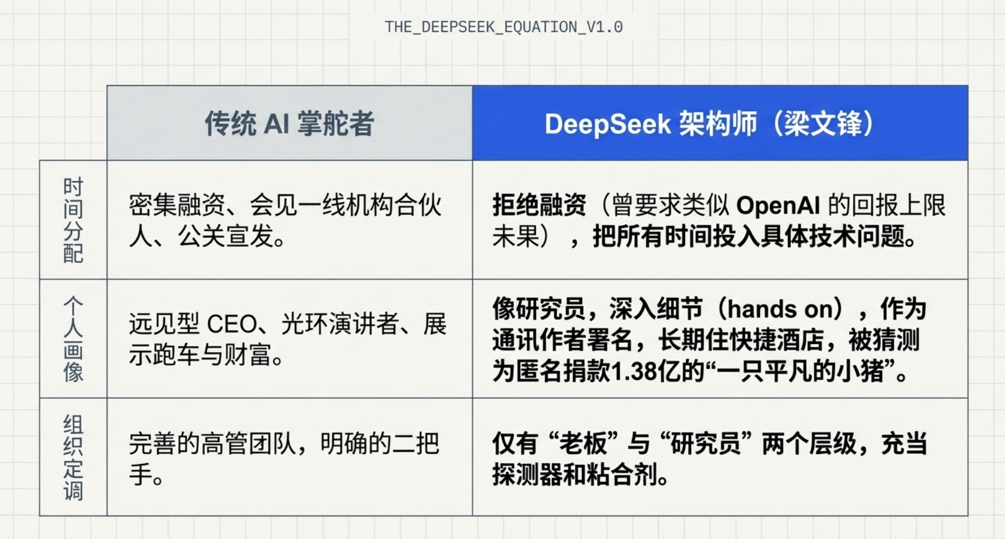 当下的AI圈,卷到离谱。Google、OpenAI、字节的核心研发,每周工作70-80小时是常态;智谱、MiniMax、Kimi疯狂迭代模型,一年更新4-5版,扎堆抢Agent、多模态赛道;大厂动辄开出2-3倍薪资、8位数总包,挖角AI核心人才。而AI 圈黑马 DeepSeek 近期却有点“销声匿迹”,其 V4 版本从春节延期至 4 月仍未官宣,核心成员还被腾讯等大厂挖角。但这家不足 200 人的公司却坚持拒绝融资、不加班、不卷 KPI,堪称行业异类,而这一切都离不开创始人梁文锋。他 30 岁实现财富自由,行事低调,将 DeepSeek 打造成反内卷实验室。