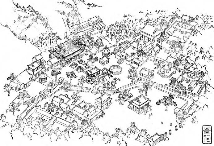 古晋祠鸟瞰图,图片来源刘敦桢《中国古代建筑史》