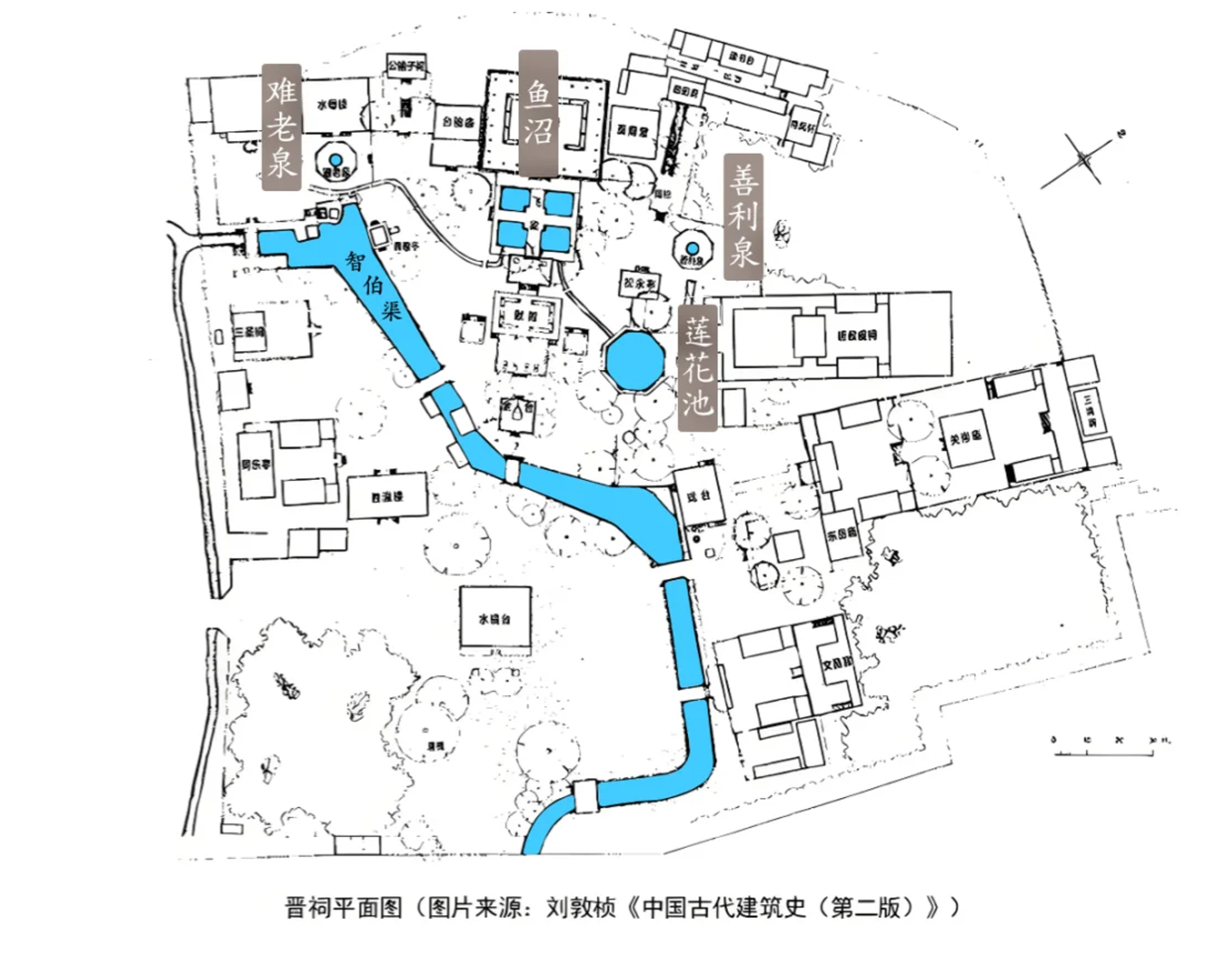 晋祠平面图,图片来源刘敦桢《中国古代建筑史》