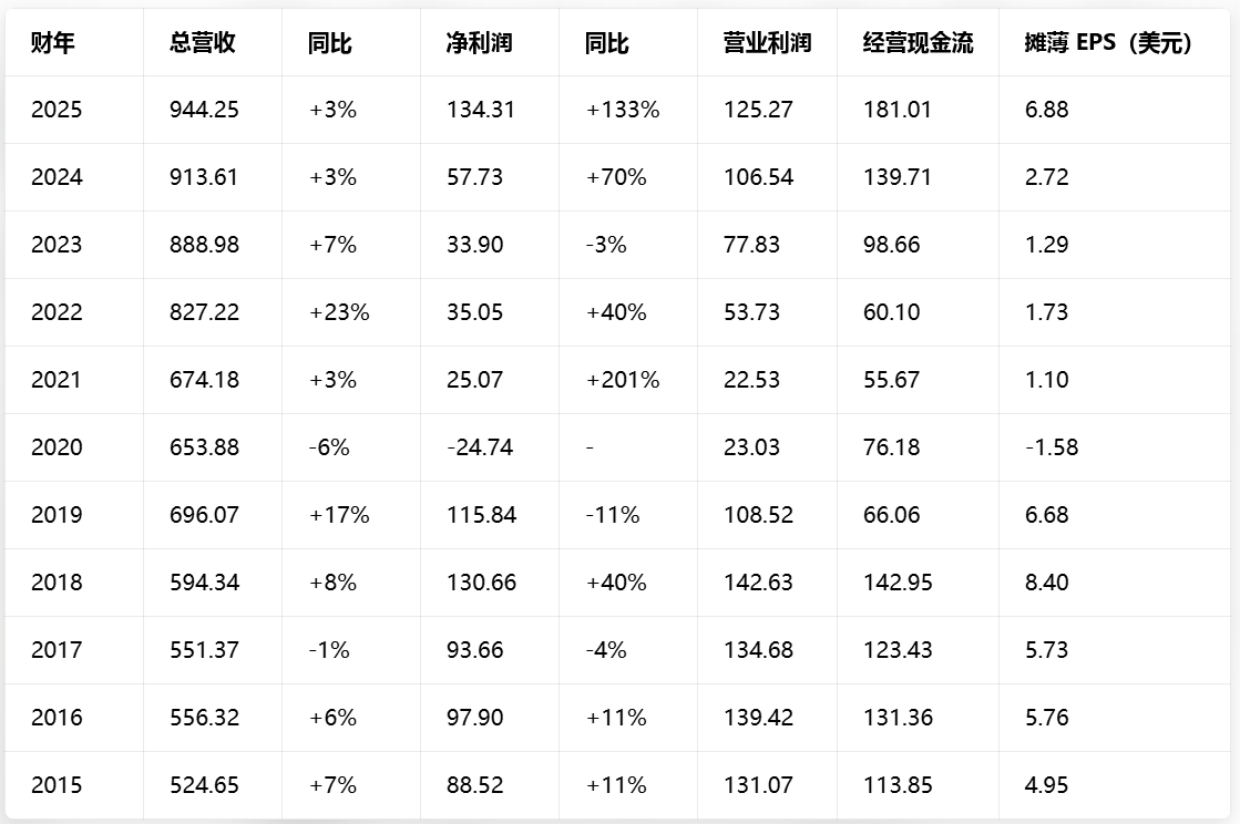 迪士尼2015-2025财年主要财务数据