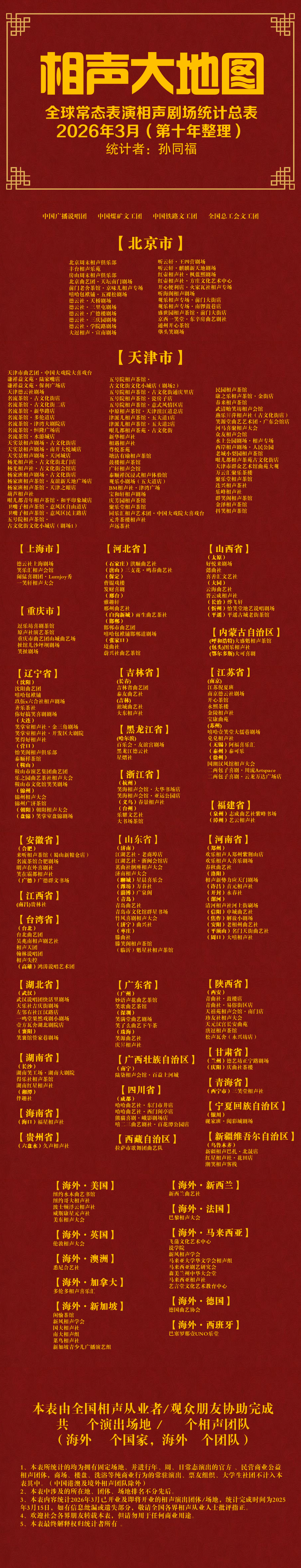 在这里还要特别鸣谢孙同福老师十年如一日地坚持整理《相声大地图——全球常态表演相声剧场统计总表》,为相声同行和听户们提供了到全世界吃空挖相的清晰线索!下文也把2026年新版放出来,供各界听户雅阅。