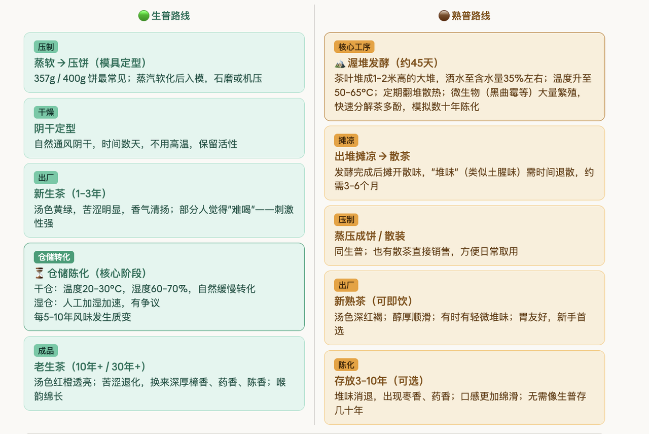 以传统手工制作技艺精制的,通过自然发酵的生茶,在通风、干燥、无异味的条件下可以长期保存,储存年限越长,口感越佳、价值逐年增长,具备保值增值的收藏功能,被称为“可以喝的古董”。