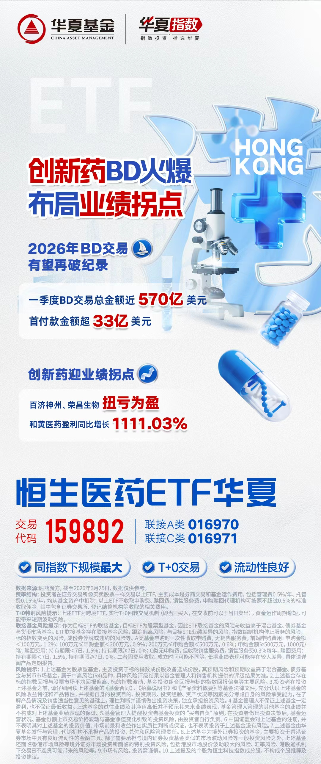 产品风险提示:1.华夏恒生医药ETF为股票基金,主要投资于标的指数成份股及备选成份股,其预期风险和预期收益高于混合基金、债券基金与货币市场基金,属于风险等级(R4)品种,具体风险评级结果以基金管理人和销售机构提供的评级结果为准。2.本基金存在标的指数回报与股票市场平均回报偏离、标的指数波动、基金投资组合回报与标的指数回报偏离等主要风险。3.本基金可投资存托凭证,基金净值可能受到存托凭证的境外基础证券价格波动影响,存托凭证的境外基础证券的相关风险可能直接或间接成为本基金的风险。4.投资者在投资本基金之前,请仔细阅读本基金的《基金合同》、《招募说明书》和《产品资料概要》等基金法律文件,充分认识本基金的风险收益特征和产品特性,并根据自身的投资目的、投资期限、投资经验、资产状况等因素充分考虑自身的风险承受能力,在了解产品情况及销售适当性意见的基础上,理性判断并谨慎做出投资决策,独立承担投资风险。5.基金管理人不保证本基金一定盈利,也不保证最低收益。本基金的过往业绩及其净值高低并不预示其未来业绩表现,基金管理人管理的其他基金的业绩并不构成对本基金业绩表现的保证。6.基金管理人提醒投资者基金投资的“买者自负”原则,在投资者做出投资决策后,基金运营状况、基金份额上市交易价格波动与基金净值变化引致的投资风险,由投资者自行负责。7.中国证监会对本基金的注册,并不表明其对本基金的投资价值、市场前景和收益作出实质性判断或保证,也不表明投资于本基金没有风险。8.本产品由华夏基金发行与管理,代销机构不承担产品的投资、兑付和风险管理责任。9.市场有风险,投资须谨慎。