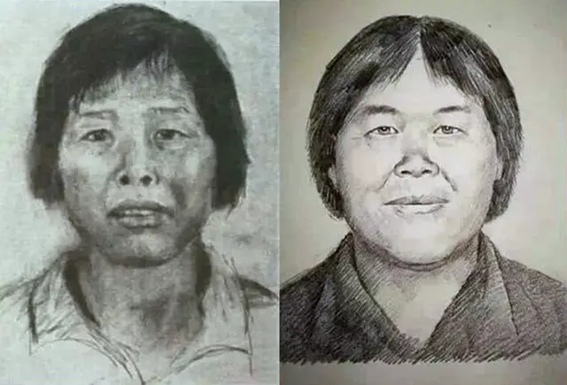 “梅姨”通缉素描像第一版(左)第二版(右)