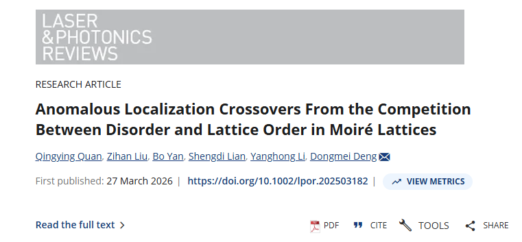 高校本科生科研能力持续亮眼,创新成果登上国际顶级期刊。近日,华南师范大学光电科学与工程学院邓冬梅研究员指导的本科生团队,在光子莫尔晶格研究领域取得重要突破,成果发表于光学顶刊《Laser & Photonics Reviews》,2022级本科生全庆颖为第一作者,学校为唯一完成单位。研究揭示了莫尔晶格中反常局域化转变规律,为光子芯片等前沿应用提供新理论支撑。这也是该校“追光者”本科生科研团队的又一重磅成果,团队学子屡登高水平期刊、斩获国家级科创大奖,彰显高校本科生创新培养的扎实成效。