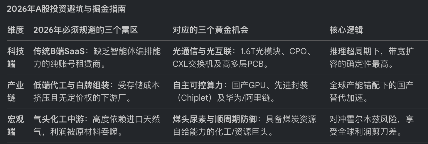 站在天量成交的十字路口,A股投资者必须从“幻象”转向“实战”。我们需坚决规避缺乏定价权的下游代工和纯B端SaaS,转而拥抱具备全球竞争力的底层硬件与资源。