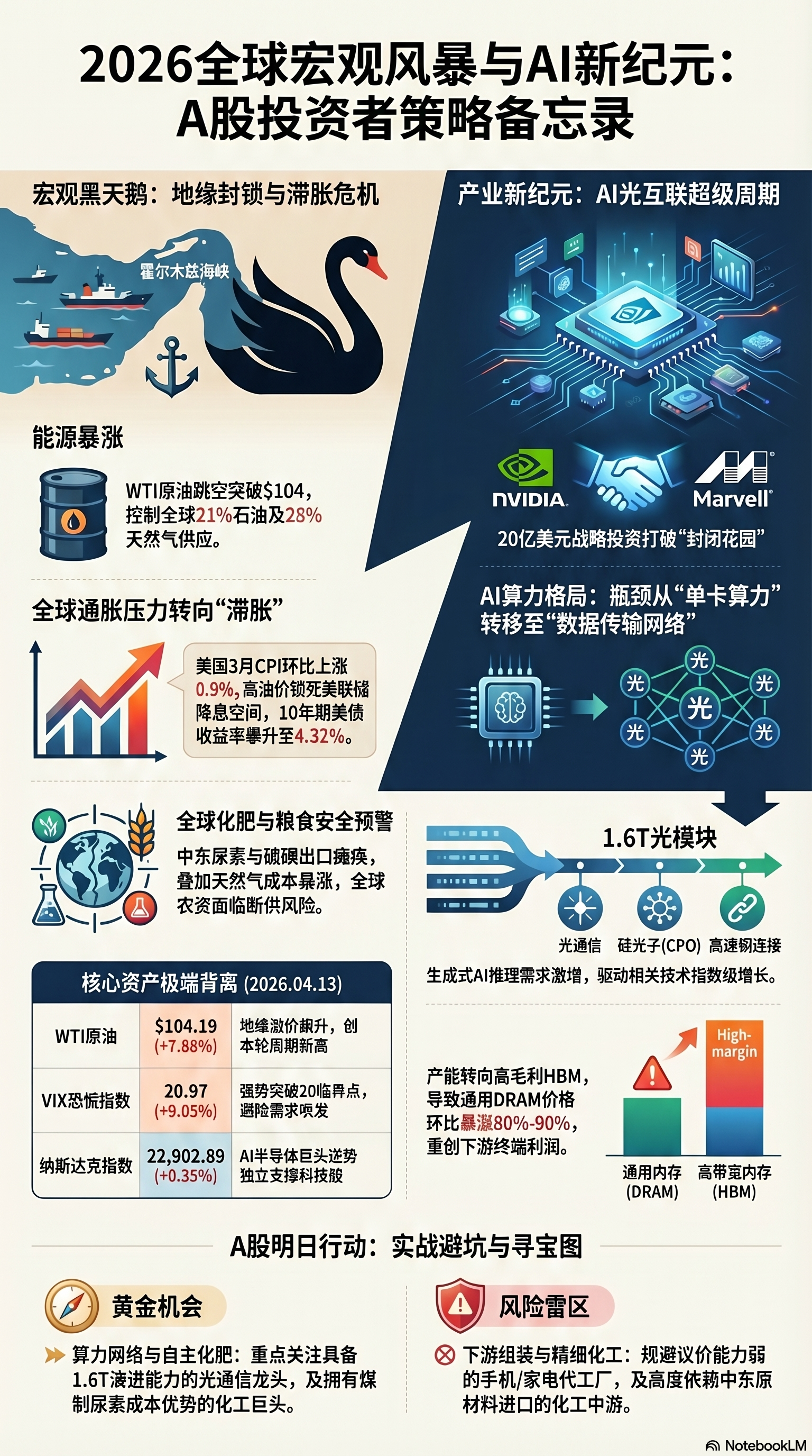 2026年4月13日,全球资本市场正在经历一场史诗级的“极致撕裂”。这一天,历史的指针指向了两个极端:一边是霍尔木兹海峡全面封锁引发的宏观黑天鹅,WTI原油暴力跳空击穿104美元大关,VIX恐慌指数狂飙至20.97的牛熊临界点,美国10年期国债收益率死钉在4.32%的高位;另一边,硅谷的算力信仰却在硝烟中逆风翻盘,纳斯达克凭借AI半导体巨头的发力单边狂飙。