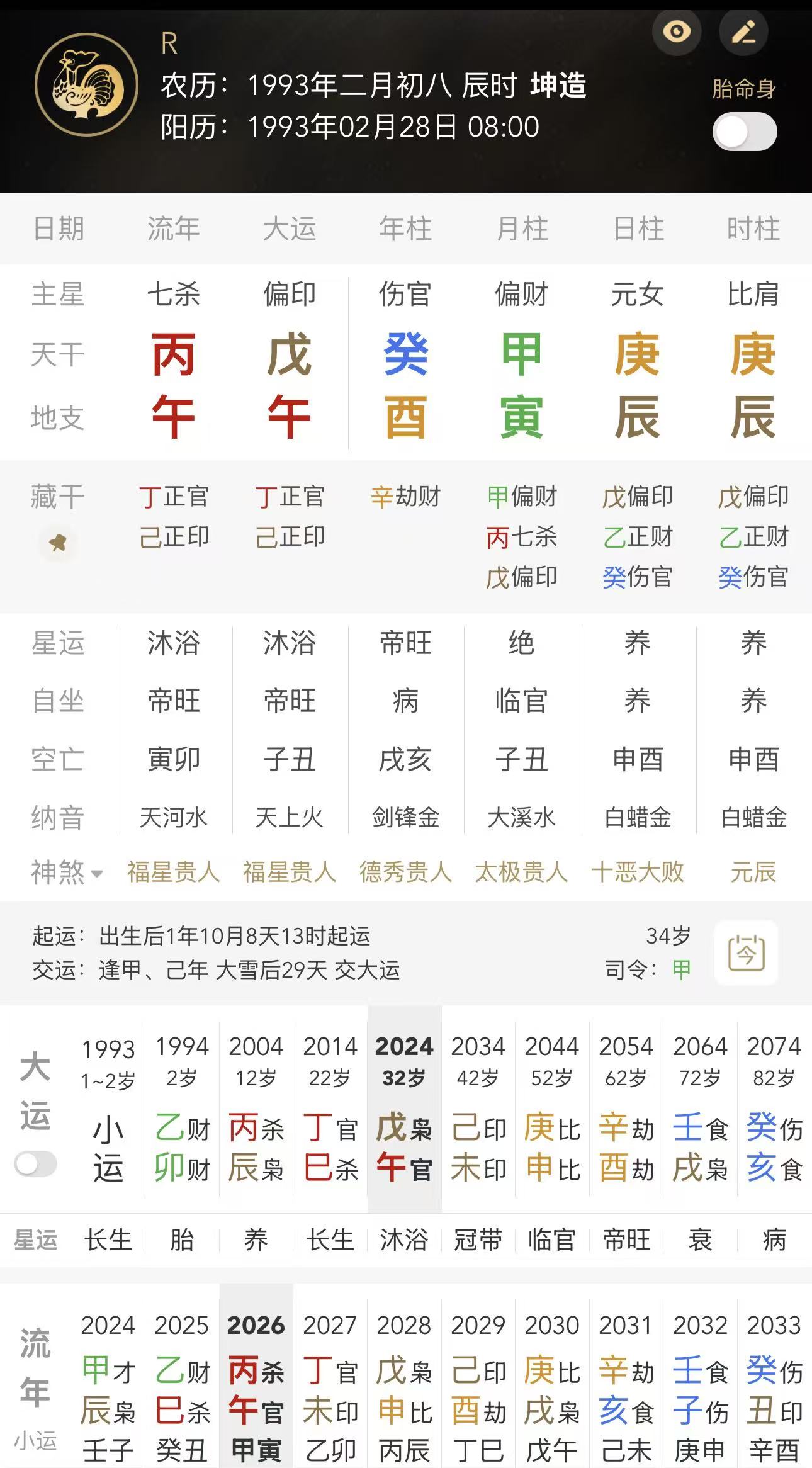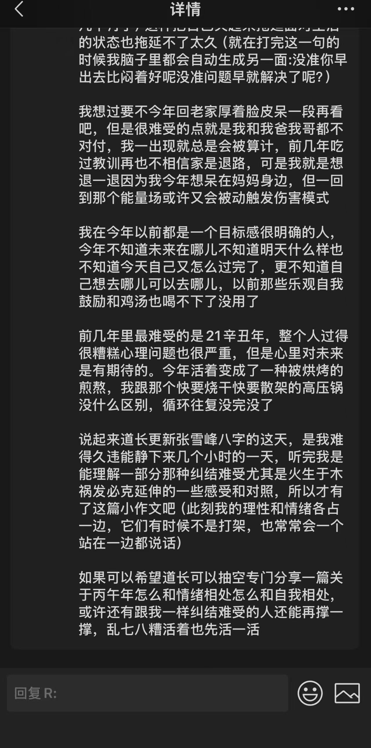 写了一堆安慰命主的话最后还是删掉了,感觉命主回家之后,大概率会被家里人搞得更emo,这种例子见多了。独居其实特别锻炼人,也是重建个人生活秩序的重要手段,多少人想从纷纷扰扰的识神世界中解绑而不得。不过话说回来,能独立出去生活的大多命中有强根,所以不害怕,而身弱者往往更喜依赖,却偏偏最应该独居以归拢能量,真是难搞。