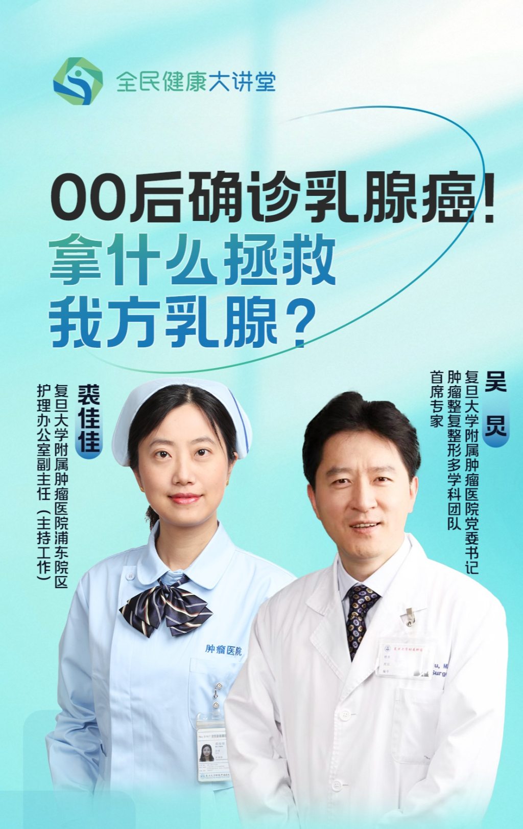 第32个全国肿瘤防治宣传周到来之际,本期节目,我们邀请到复旦大学附属肿瘤医院党委书记、乳腺外科及肿瘤整形多学科团队首席专家吴炅教授,以及复旦大学附属肿瘤医院浦东院区护理办公室副主任裘佳佳。他们将以专业的知识和温暖的视角,帮助我们厘清乳腺癌的认知误区,陪伴每一位女性科学、从容地走好健康之路。