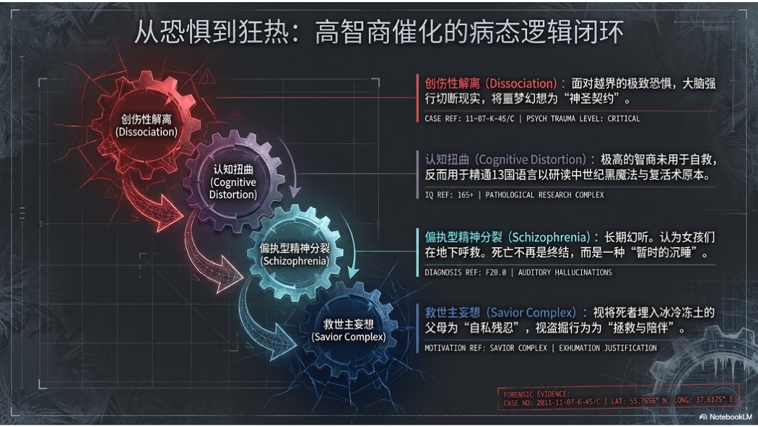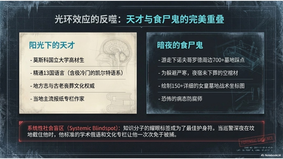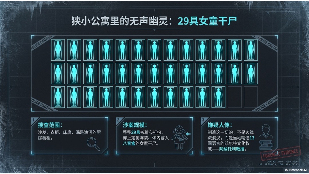 这期节目要讲的,是一起连世界犯罪史都很难绕开的真实案件。一个通晓多国语言、研究墓葬文化的天才学者,白天是备受尊敬的知识分子,夜里却长期盗掘女童新坟,把遗体带回公寓,做成穿着洋装、体内装着八音盒的人偶。更让人窒息的,不只是案件本身的病态和残忍,而是它把很多家庭最后一点哀悼的支点都彻底摧毁了。当天才、疯狂、创伤和法律撞在一起时,所谓“正义”有时并不会以大家期待的方式到来。