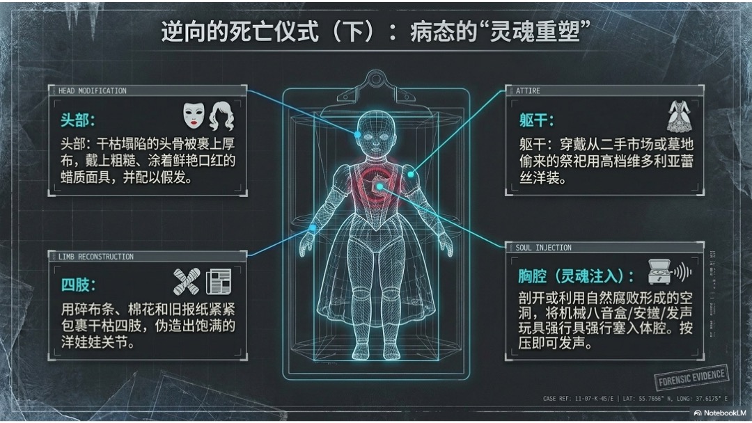• 最病态的一步,是往胸腔和腹腔里塞八音盒,让这些“人偶”在被按压时发出儿歌和摇篮曲。