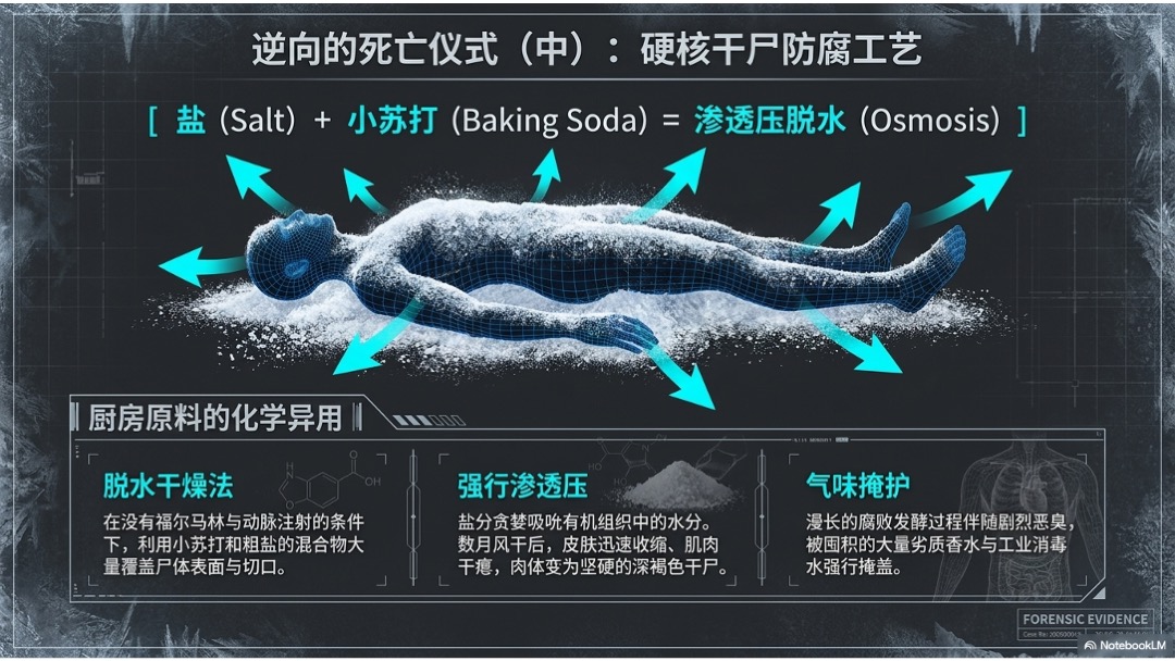 • 他用盐和小苏打脱水防腐,再用布料、假发、面具和洋装去重塑尸体外形。