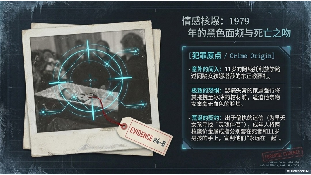 • 11岁的阿纳托利路过同龄女孩娜塔莎的葬礼,被失控的成年人强行拉到棺材前。