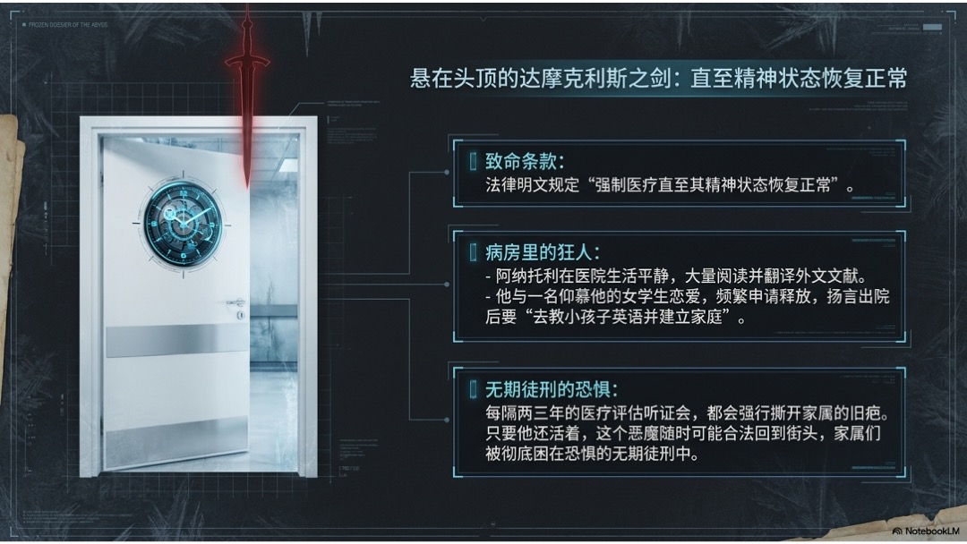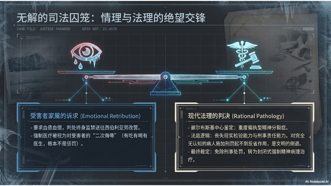 • 最终,顶尖精神病学机构认定他患有严重偏执型精神分裂症,丧失刑事责任能力。