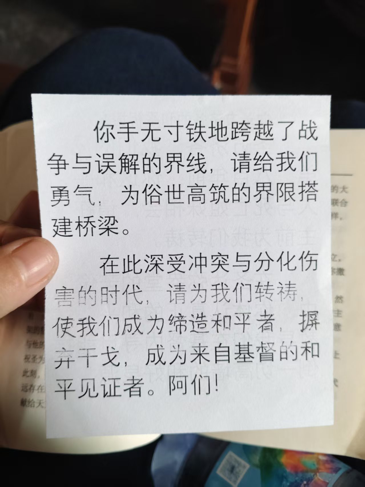 “在此深受冲突与分化伤害的时代请为我们转祷,使我们成为缔造和平者,摒弃干戈,成为来自基督的和平见证者。阿门!”