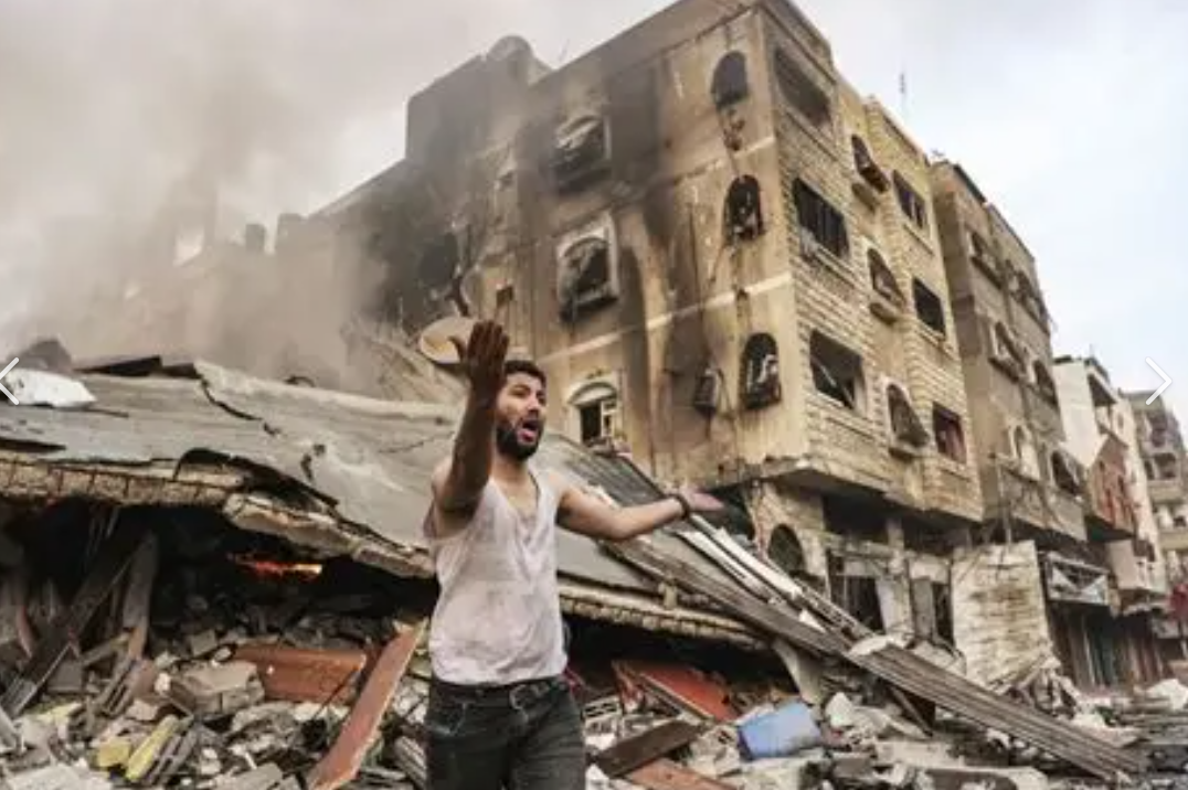 我又想起最近巴以冲突新闻里那位巴勒斯坦男子,站在被炸毁的多层建筑废墟前,身穿白色背心,双臂高举,表情痛苦地仰头呐喊,在呼救或表达极度的悲愤。他身后是满目疮痍的楼宇,墙体被熏黑、窗户尽毁,大量瓦砾和扭曲的钢筋散落一地,浓烟仍在从废墟中升腾,战争充满了毁灭与绝望。相隔近百年,跨越几万里,同样的炮火,同样的无助。