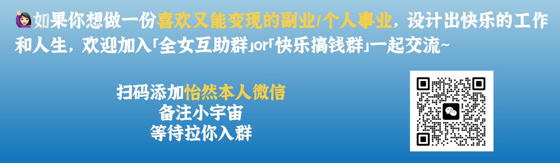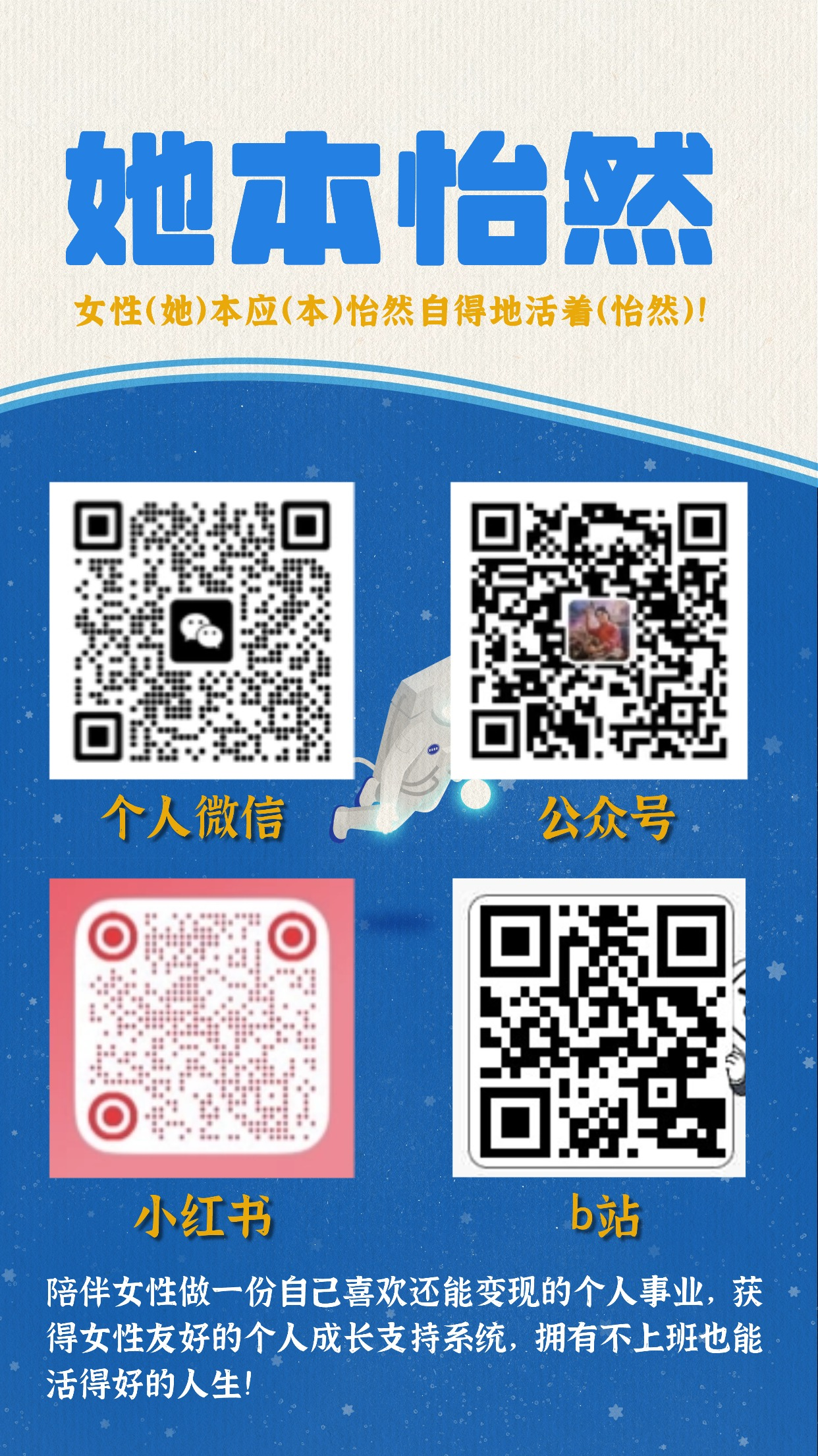 我希望陪伴女性做一份喜欢又能变现的个人事业,设计出快乐的工作和人生,享受不上班也能活得好的状态!欢迎加我本人微信(tabenyiran,即她本怡然的全拼),添加时请备注“小宇宙”,可以找我免费领取《决胜职场内外关键场景的9大故事模型》哦~