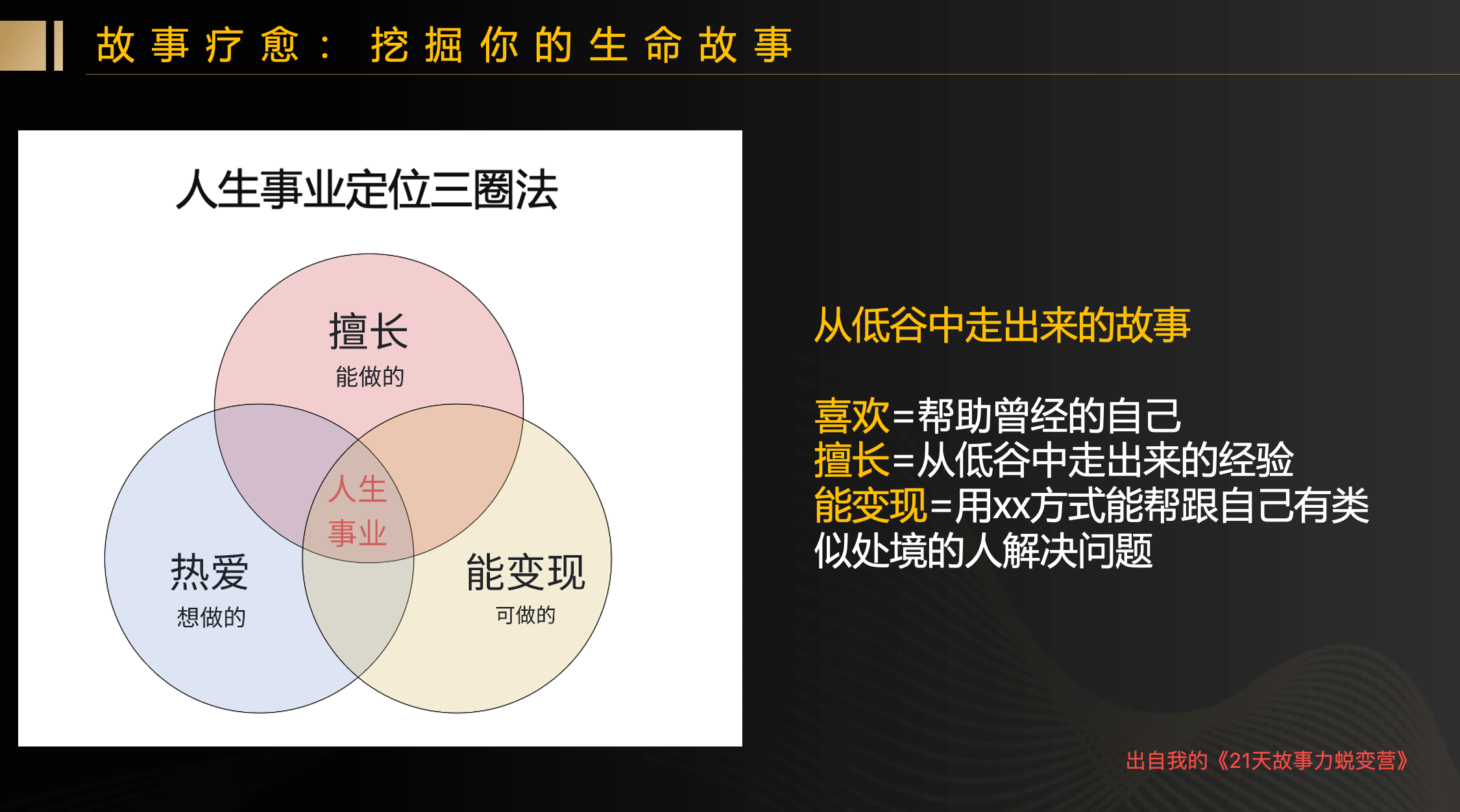 ✍️《21天故事力蜕变营》:21天,带你养成故事力思维,发现人生第二曲线。用课程工作坊与深度陪伴答疑的社群训练营的方式,帮大家拿实打实拿到结果,每个人都可以找到喜欢又能变现的的副业/个人事业方向,并能够通过讲故事来赢得支持、链接资源,建立个人影响力,适合实实在在想逼自己一把坚持练习去拿到结果的姐妹,需要有一定预算~
