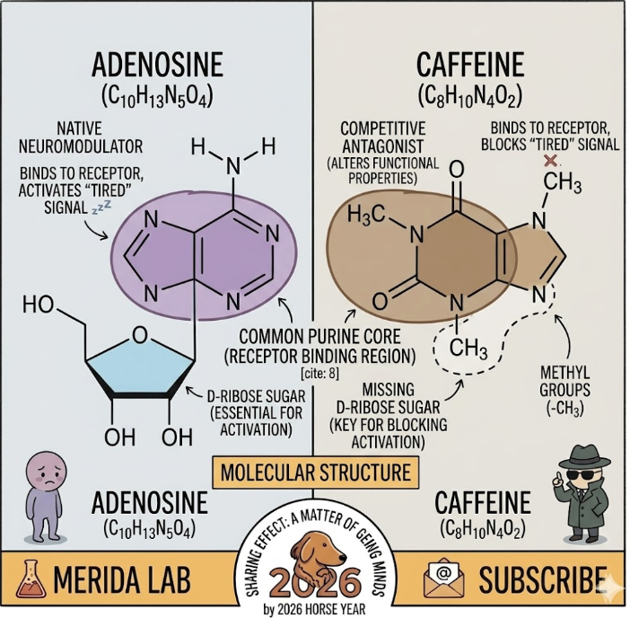 咖啡因这把‘易容钥匙’唯一的不同,就是它少了那个用于‘开机’的蓝色核糖基团,但它成功地复制了那个‘卡位’的双环结构,这就是它能‘反锁门’的秘密!
