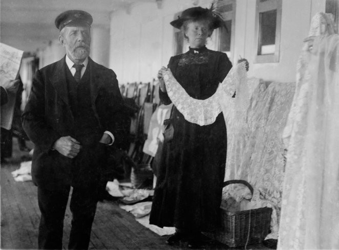 🔺 本来这位业余摄影师布朗牧师还要继续跟随“泰坦尼克”号完成剩下的旅程,因为当时船上一位富豪朋友为他提供了全程票。然而,布朗接到了上级牧师的通知,要他停止旅程立即返回驻地。图为1912年4月11日,一位妇女在“泰坦尼克”号上售卖爱尔兰饰带。