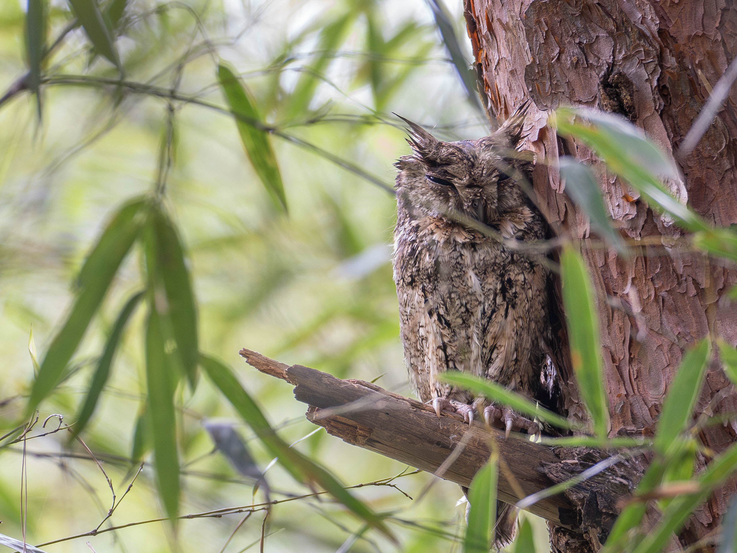 领角鸮(xiāo) (英文名:Collared Scops Owl,学名:Otus lettia),是鸮形目鸱鸮科角鸮属的鸟类。为鸱鸮科角鸮属的小型猫头鹰,原作为印度领角鸮的亚种。广泛分布于南亚至中国南部和台湾,常见于森林、山地阔叶林和混交林,甚至村寨附近的树林内。体长约23-25厘米,是最大型的角鸮之一,具有明显的耳羽和黑色轮廓勾勒的浅色脸部。羽毛颜色有灰褐色和赤褐色两种形态。