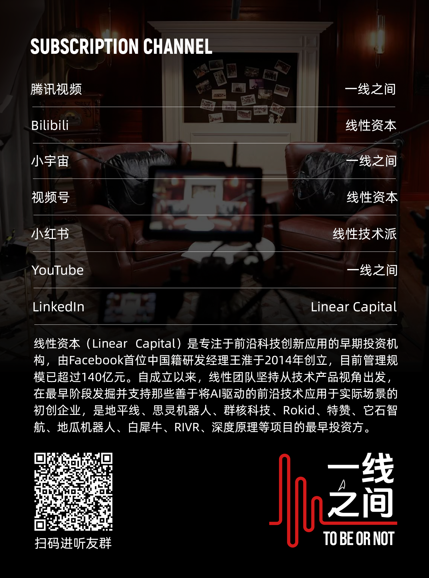 Disclaimer:本期节目所有内容仅为嘉宾个人经历分享与观点交流,不构成任何投资建议。节目中提到的观点内容,均不代表投资推荐。如需引用本播客所提及内容,还请征得线性资本同意并注明出处。原创不易,敬请谅解。