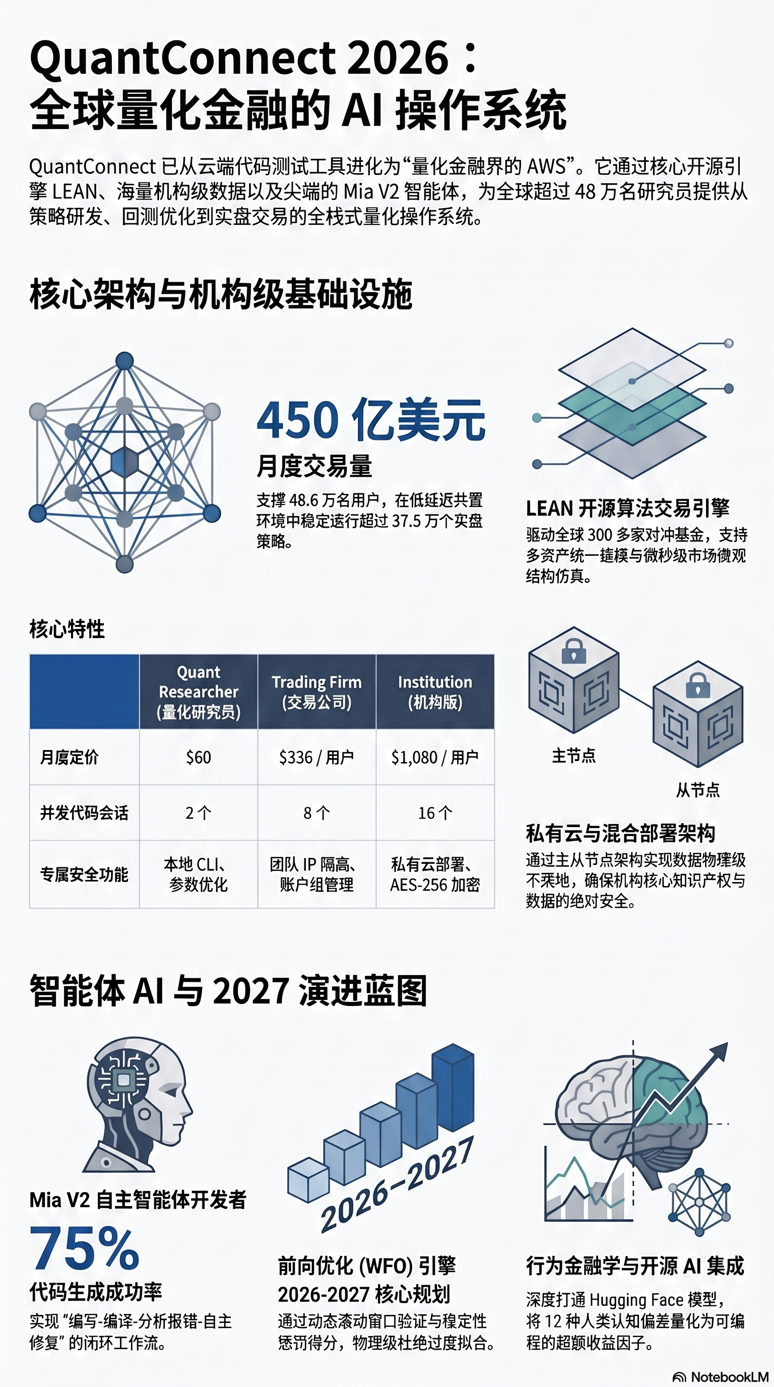 然而,正如亚马逊云服务(AWS)通过标准化接口重构了互联网,QuantConnect 的崛起标志着量化金融“AWS时刻”的全面降临。通过将底层 LEAN 引擎彻底开源,并吸引全球 180 多位核心工程师持续贡献,QuantConnect 已不仅是一个平台,而是成了拥有 300 多家对冲基金背书的行业标准。它成功地将市场微观结构模拟(Market Microstructure Simulation)从策略逻辑中解耦,让平民研究员也能在高度模块化的环境中,调用曾属于华尔街精英的“重型武器”。这不仅是工具的平民化,更是研究范式从“专有私域”向“开源模块化”的彻底转轨。