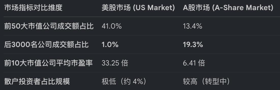 中美股市最显著的差异在于流动性的分配结构,这是一种近乎极端的对立。美股是一个高度机构化的成熟市场,而A股正处于从散户主导向机构化转型的阵痛期。