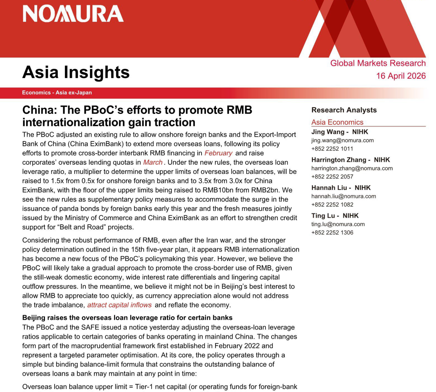 野村 2026 年 4 月 16 日发布亚洲洞察报告明确指出,央行一系列政策组合拳已显效,人民币国际化成为 2026 年政策核心,定向提升海外贷款杠杆率并非简单放松,而是稳慎推进跨境使用的关键布局。