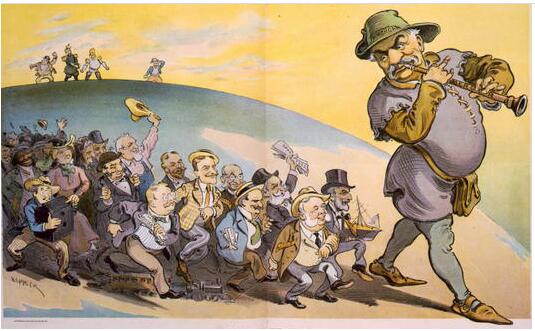 🔺 1902年的这幅漫画里,JP Morgan吹着魔笛,吸引了一批追随者,其中就包括时任美国总统罗斯福