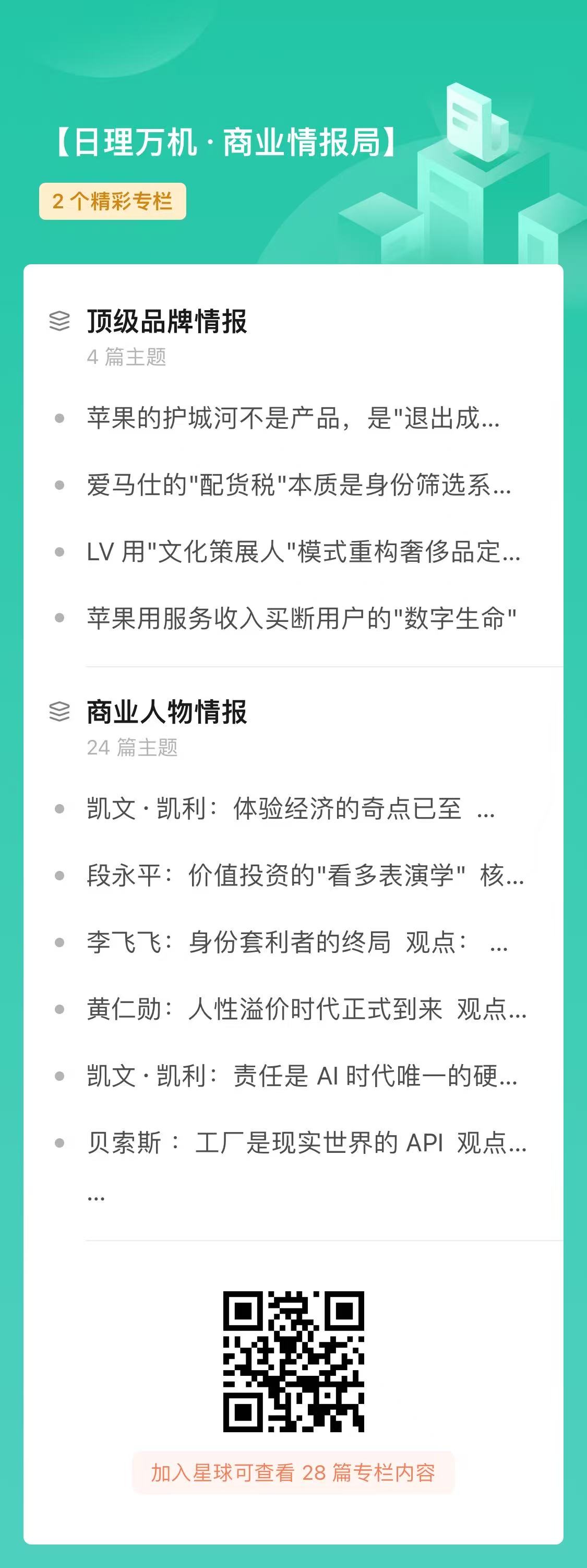 另外,咱们的【知识星球】也全面升级,在【全球人物情报】基础上,升级了【顶级品牌品牌】。各位可以扫码入: