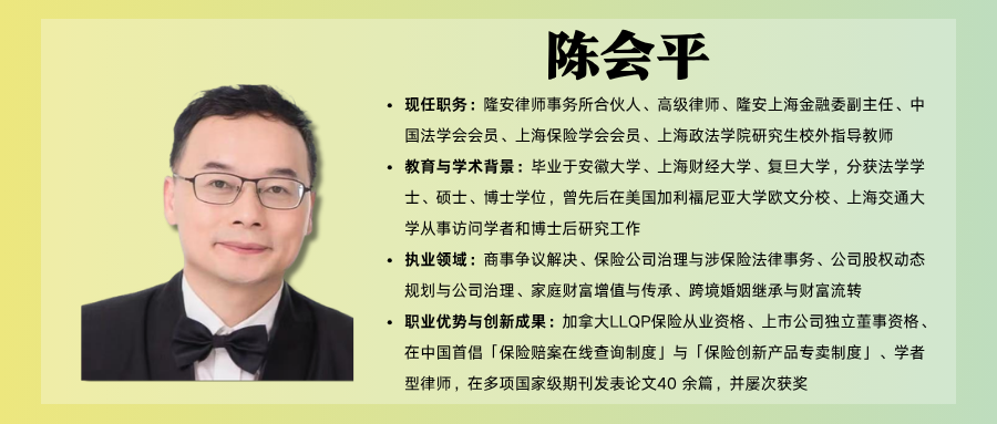 陈会平律师,现任北京市隆安律师事务所上海分所合伙人、高级律师,同时担任上海保险学会会员,拥有中国上市公司独立董事资格与加拿大LLQP保险从业资格。陈律师系复旦大学博士,曾先后在美国加利福尼亚大学欧文分校、上海交通大学从事访问学者和博士后研究工作。