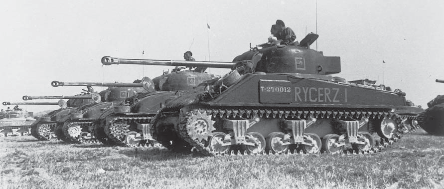 集结受阅的波兰第二装甲师谢尔曼IC“萤火虫”坦克群,除近处的“骑士一号”为标准IC外,其余都为铸造式前部车体的混血IC,炮管前半部分的迷彩是用于将自己伪装成普通的75毫米炮型谢尔曼,因一些德军部队倾向于优先攻击“萤火虫”。摄于1945年8月