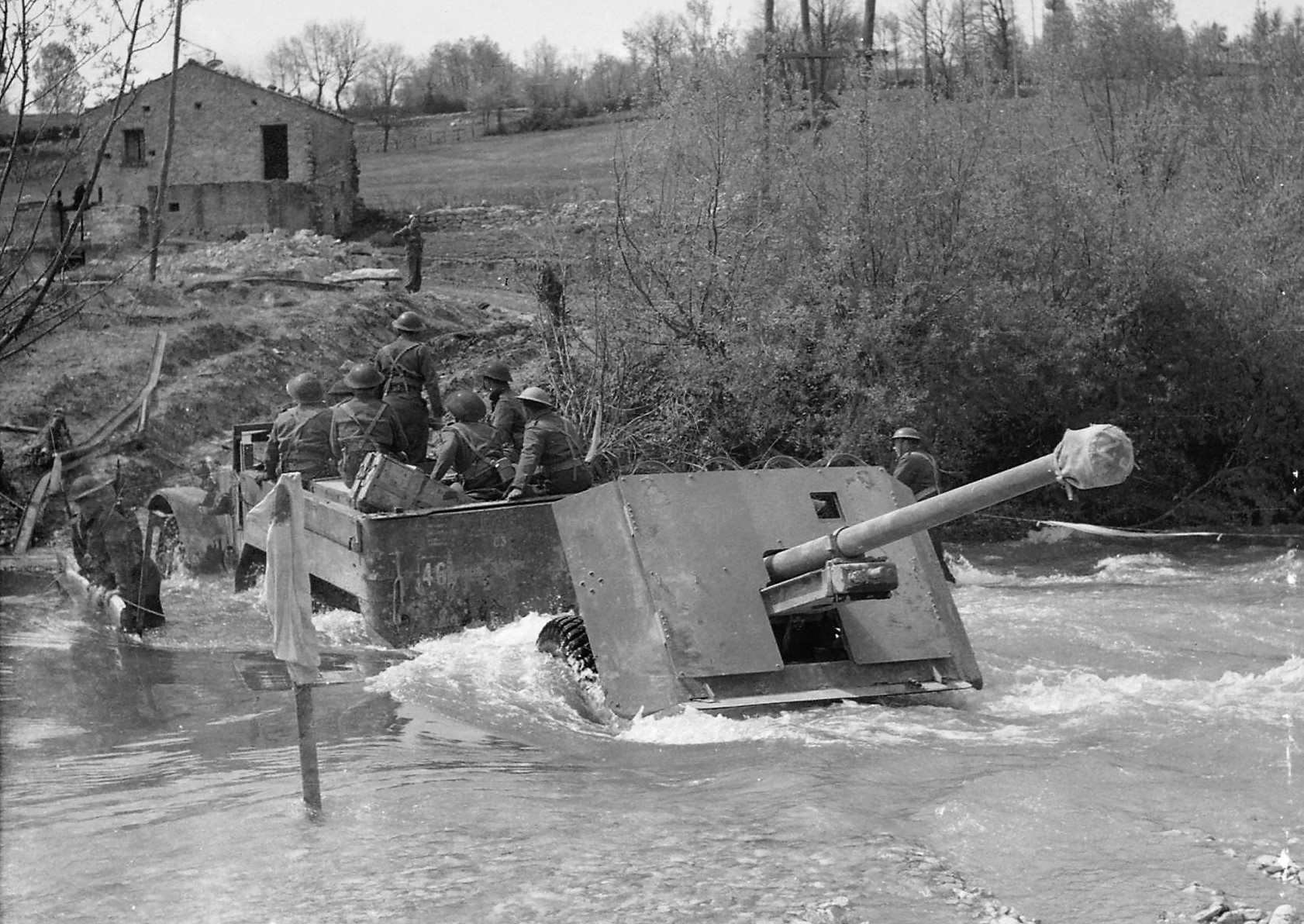加拿大部队用半履带车拖曳17磅反坦克炮渡河