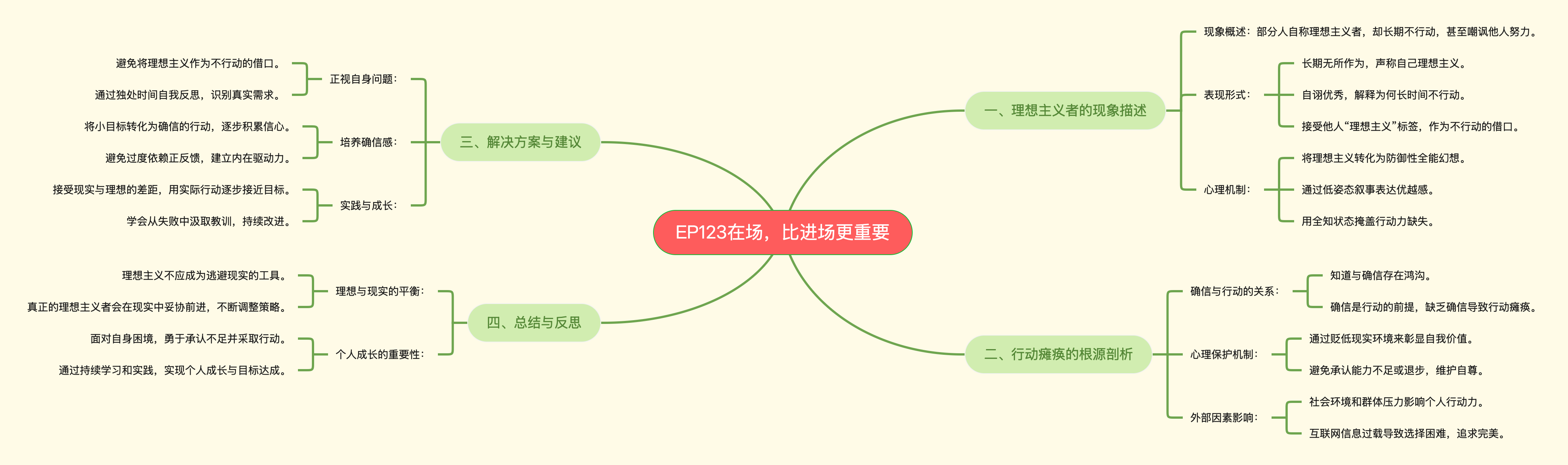 - 避免将理想主义作为不行动的借口:先承认自己的停滞,不是因为理想主义,而是因为害怕、拖延、不自信。