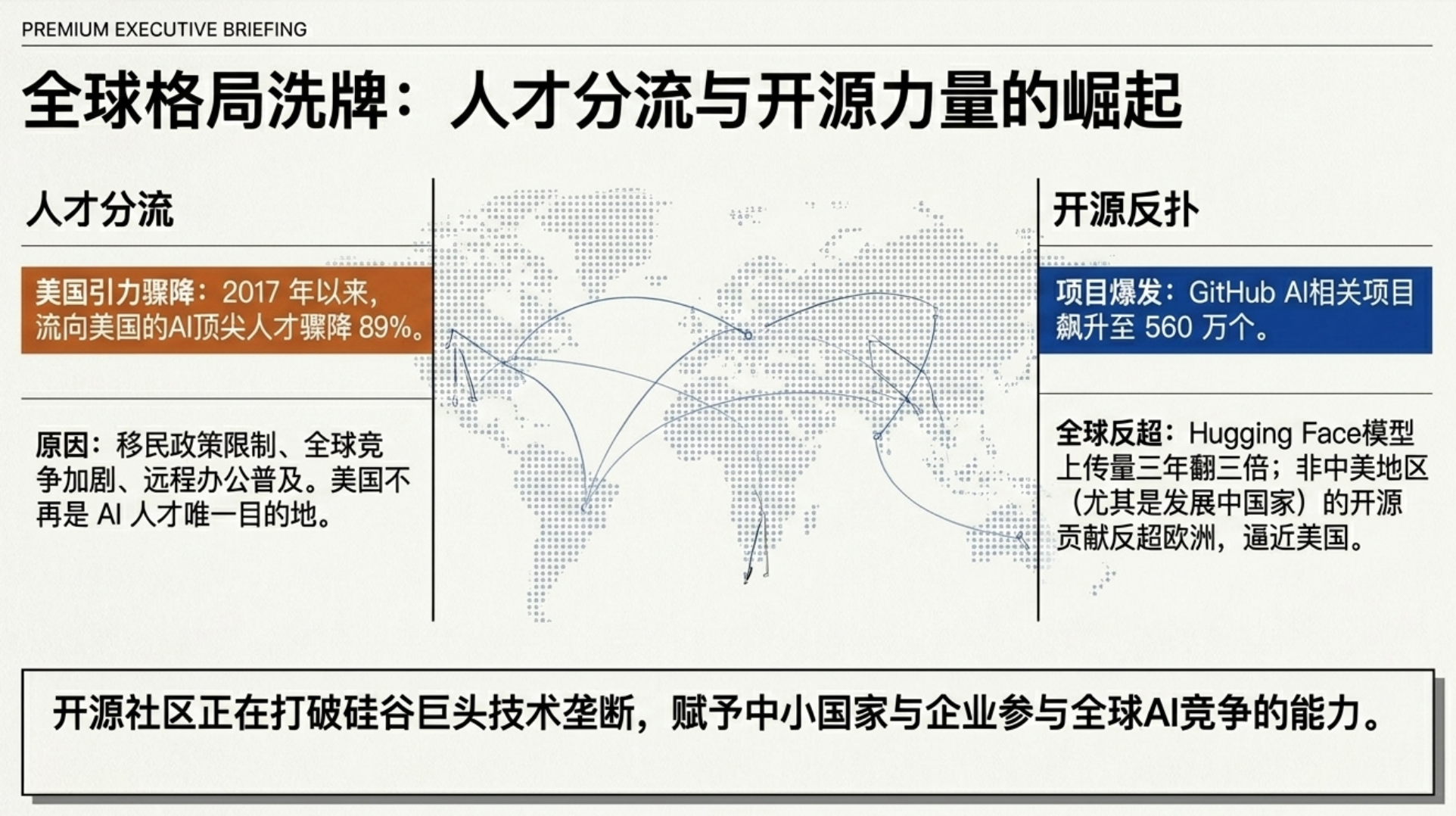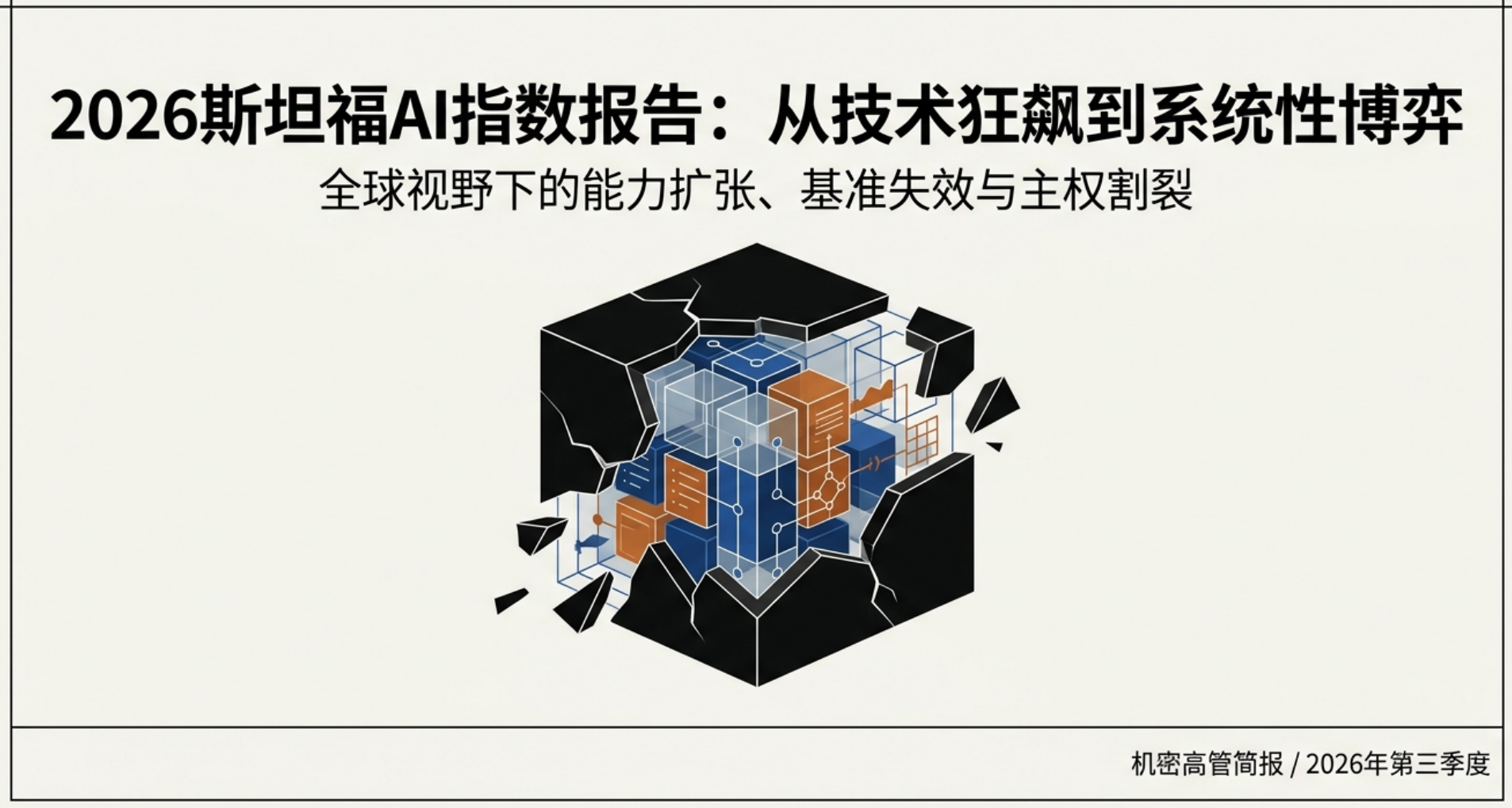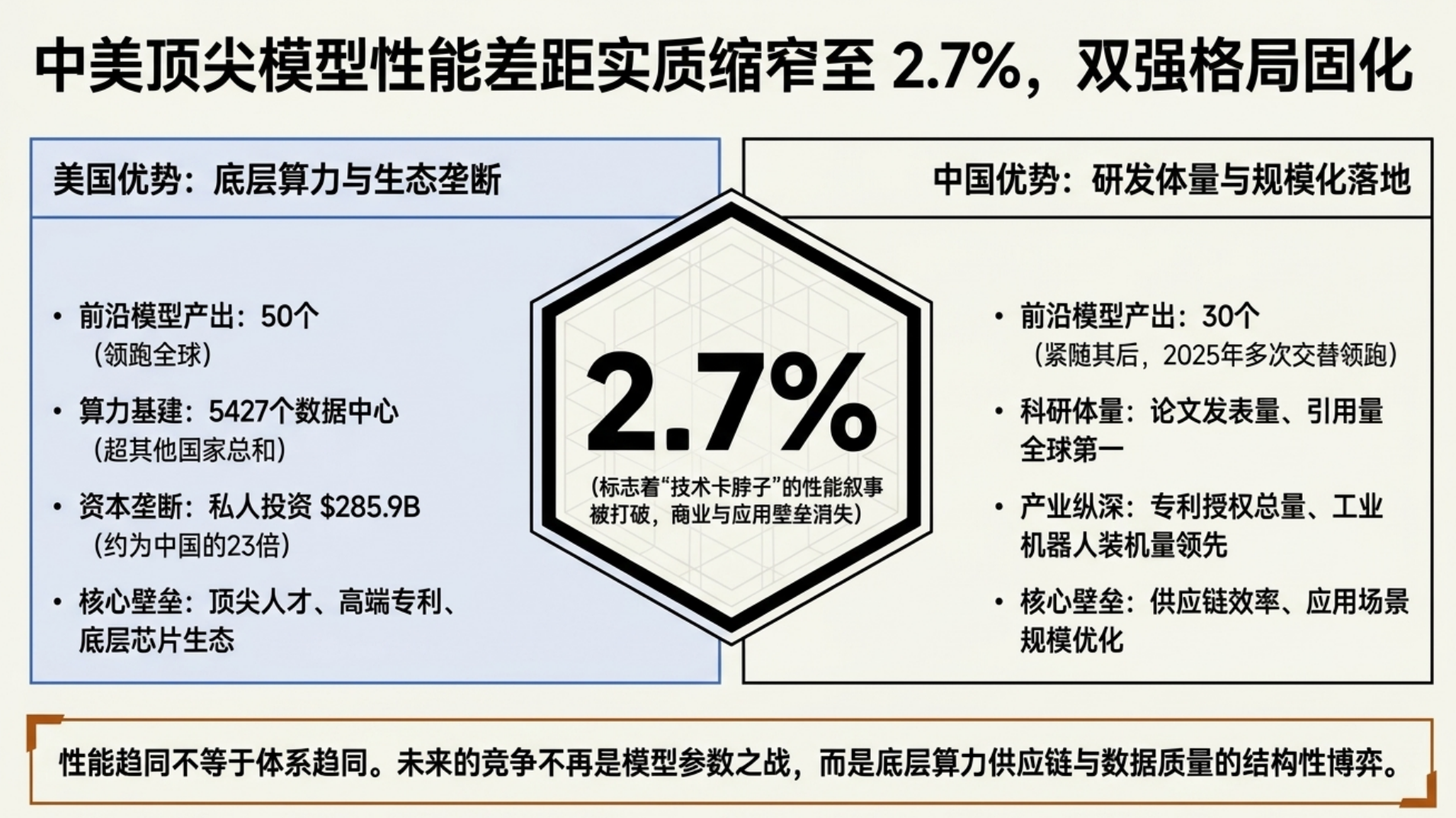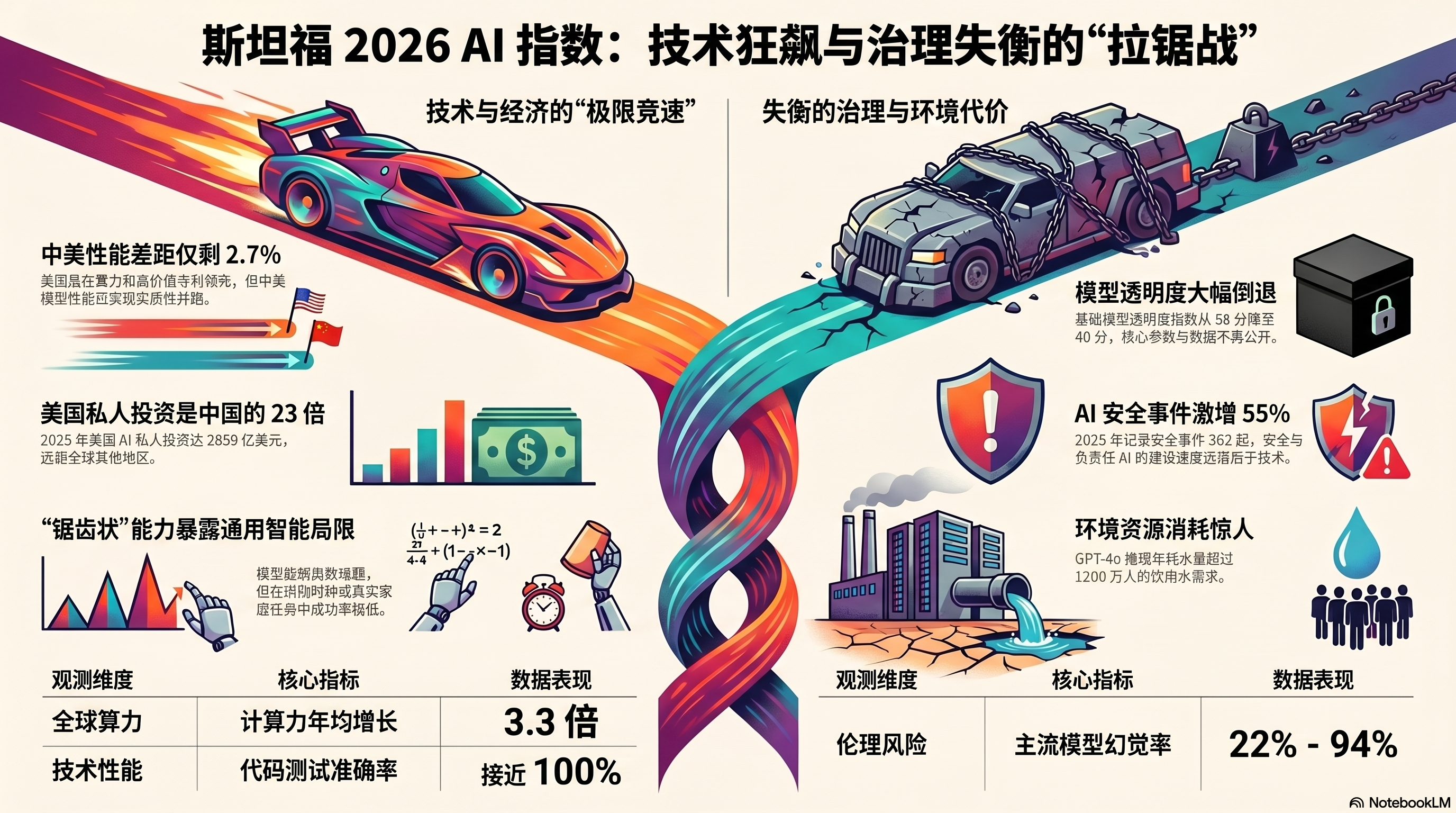 近日,美国斯坦福大学人工智能研究所发布了《2026年AI指数报告》。这份423页的年度报告深度剖析了全球人工智能在2025至2026年间的演进态势,强调技术虽进入规模化落地阶段,但治理与评估体系已严重滞后。文中指出中美两国在模型性能上的差距已缩小至2.7%,标志着竞争核心正从单纯的参数比拼转向算力供应链与生态体系的对抗。此外,报告还反映了就业结构的剧烈波动以及全球范围内AI主权意识的觉醒。