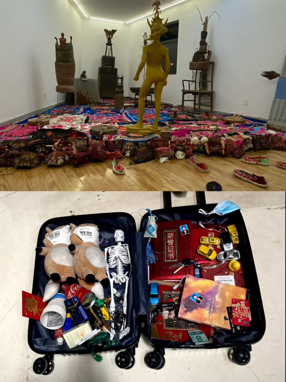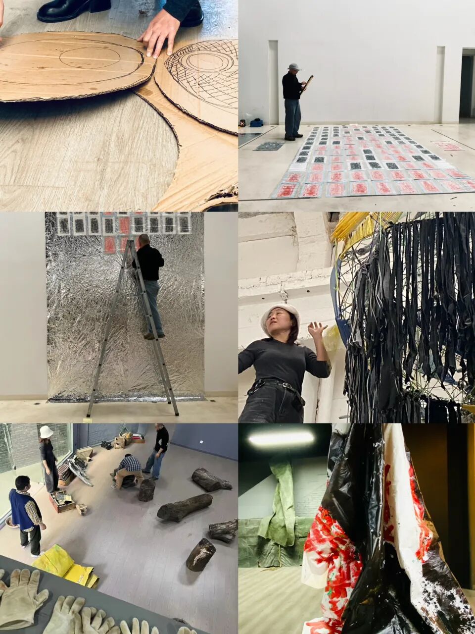 创作涵盖综合材料、纸本丙烯、水墨及装置等多种形式