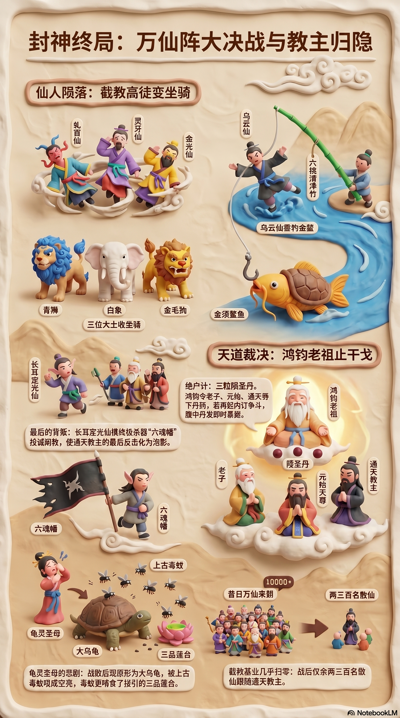 - 鸿钧道人:老子、元始、通天三位圣人之师,天道化身。本集尾声降临,严厉训斥通天教主挑起争端,赐予三圣每人一颗“陨圣丹”以约束其行为,强行平息了阐截纷争。